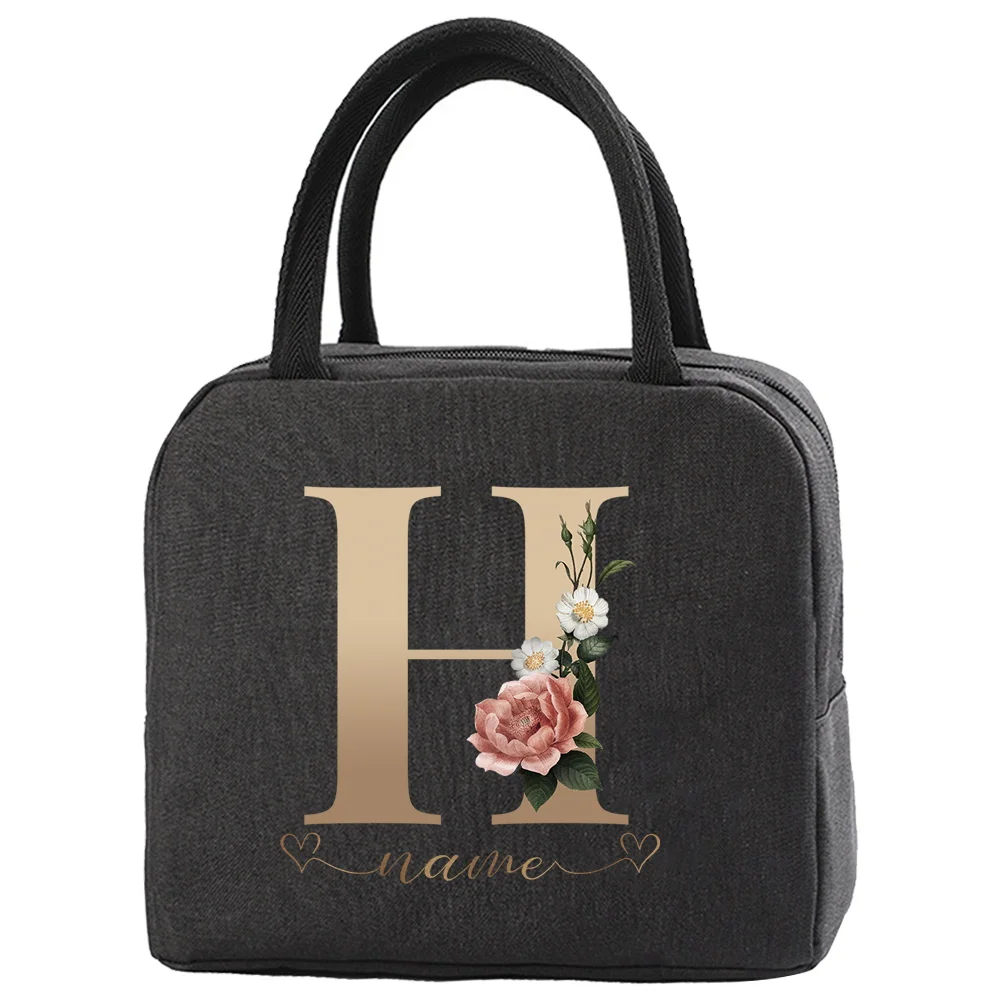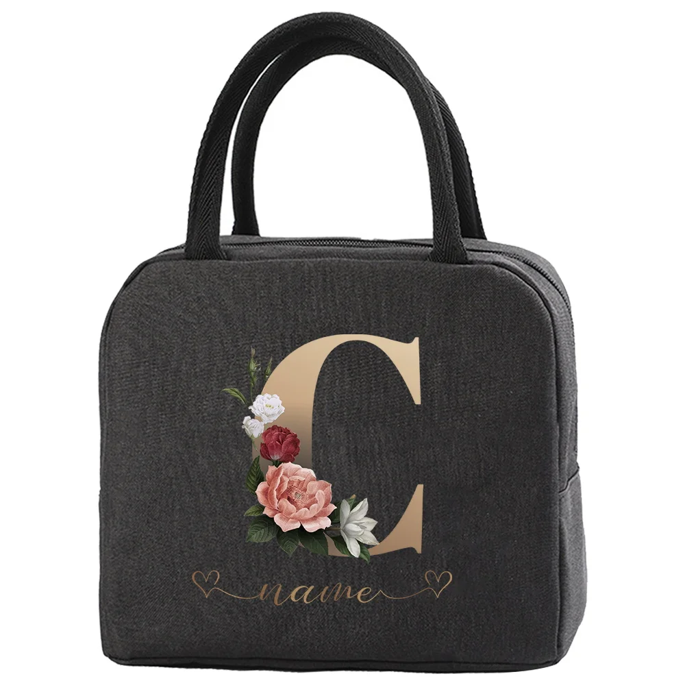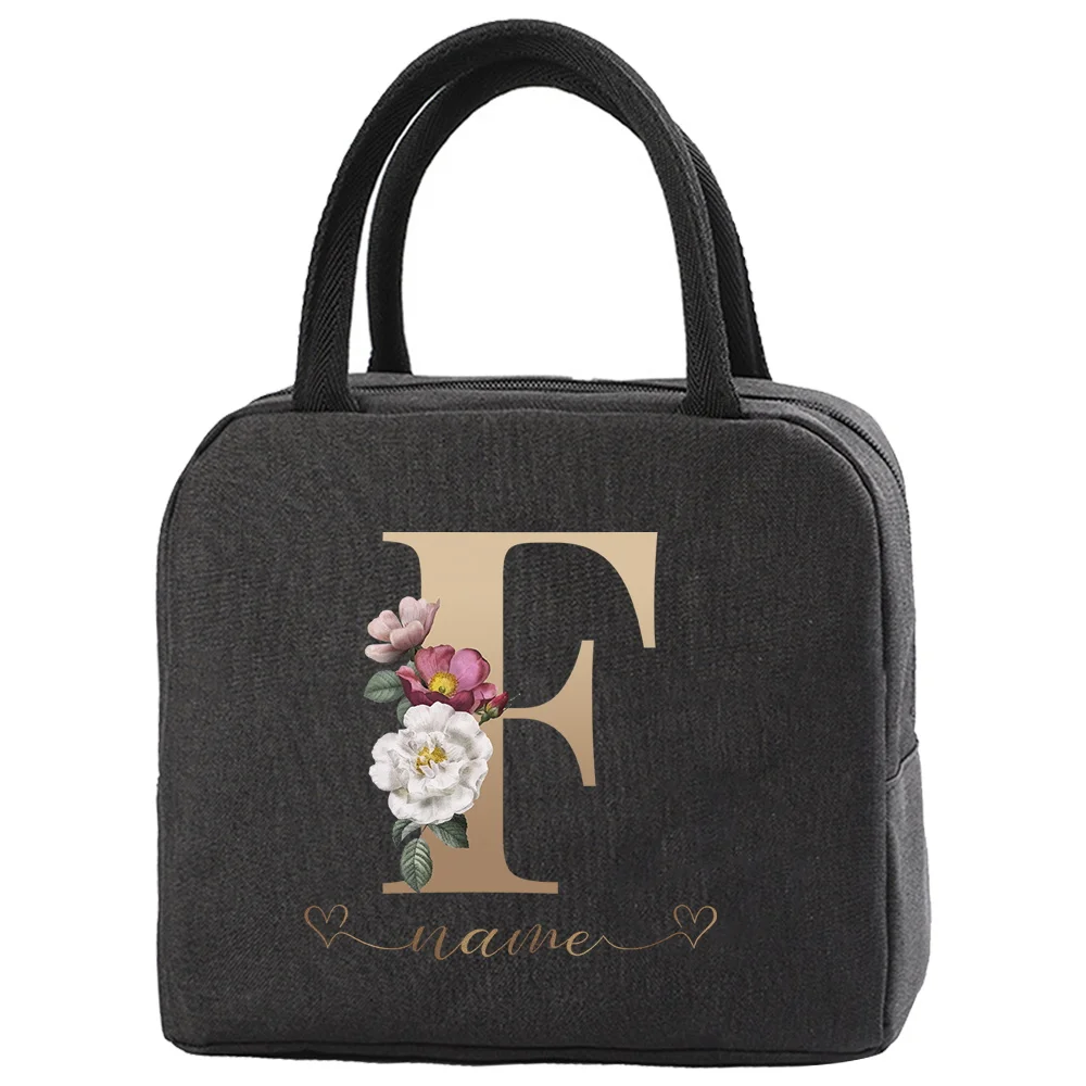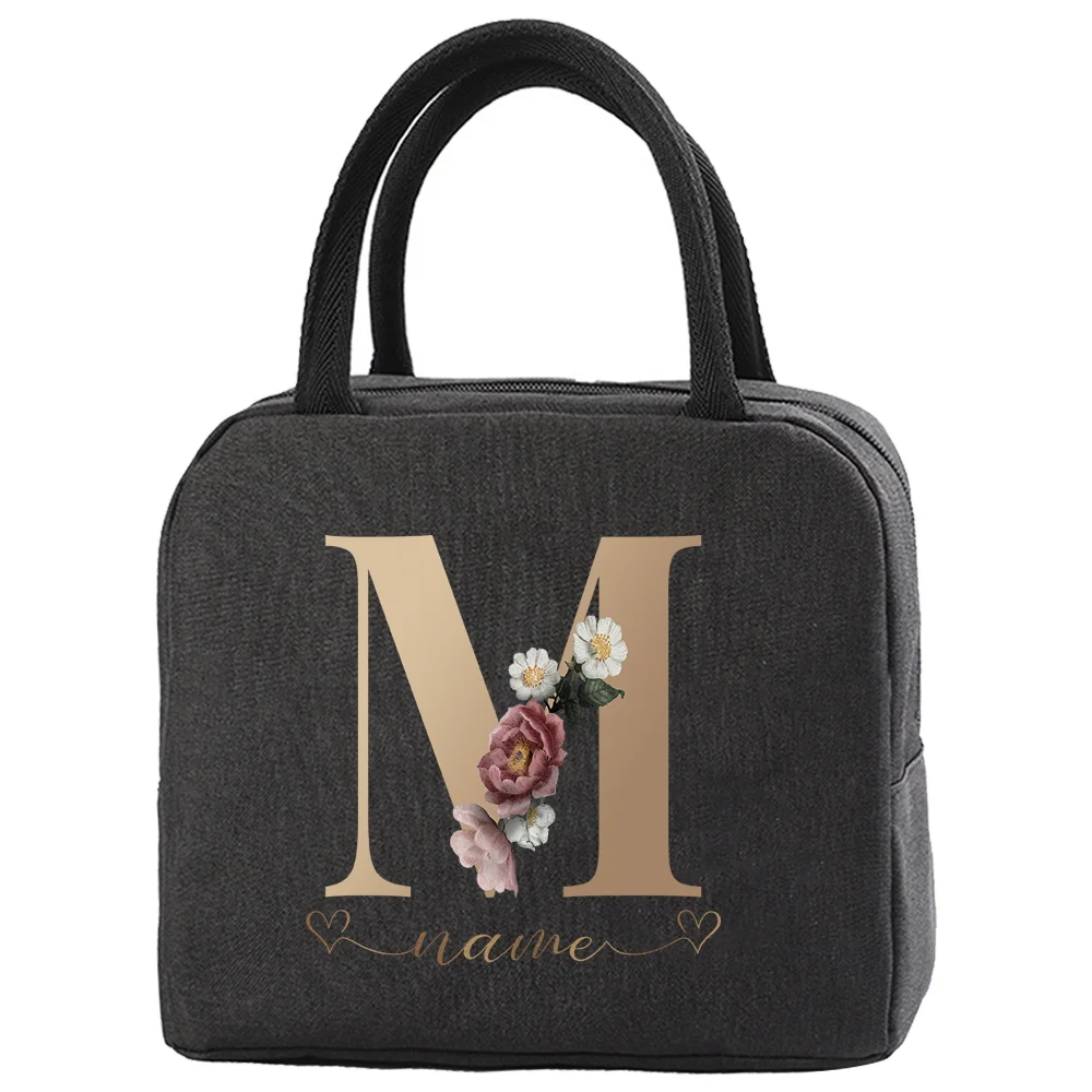 Portable Lunch Box Insulated Canvas Lunch Bag Customized Name Gold Letter Handbag Thermal Picnic Food Bags for Women Kids
