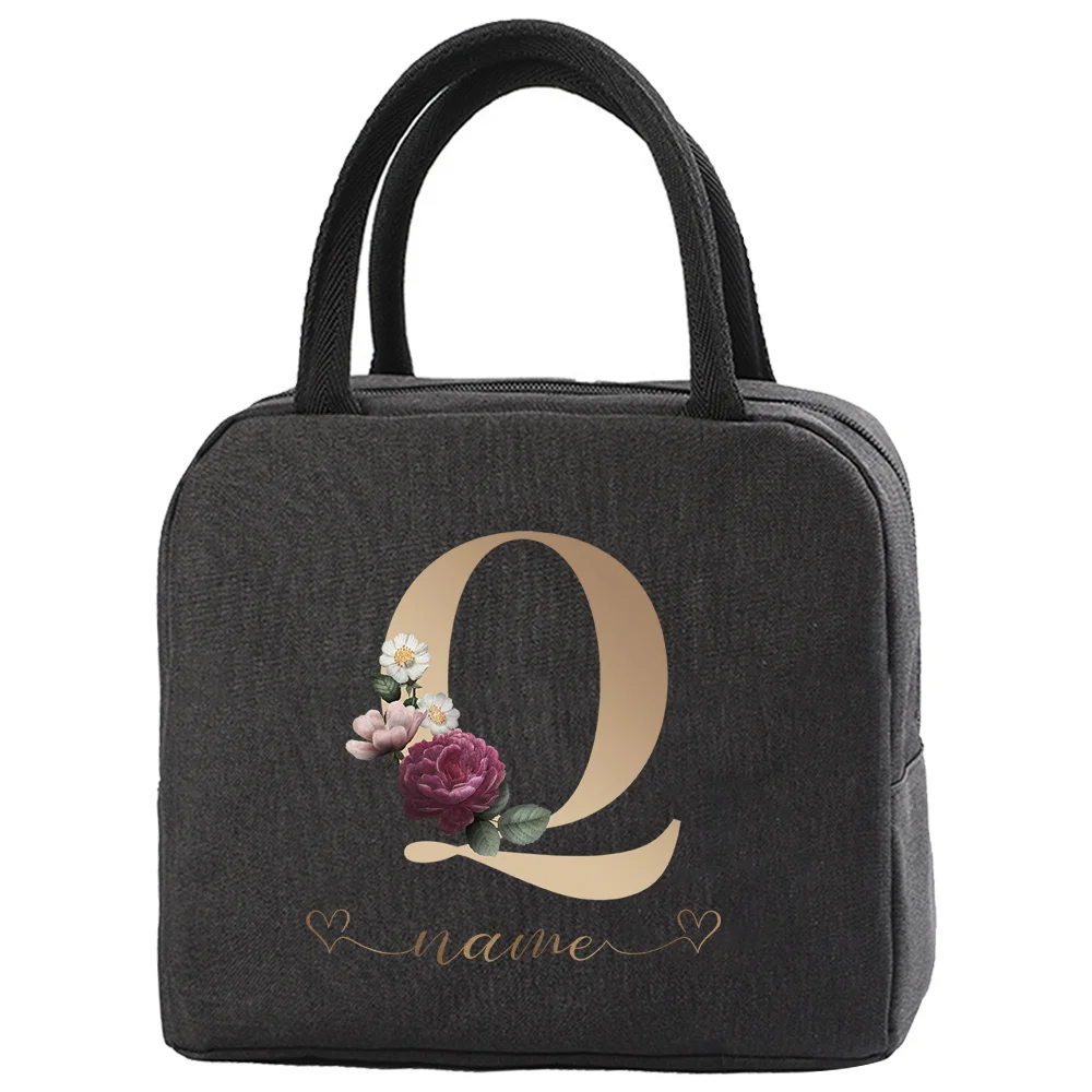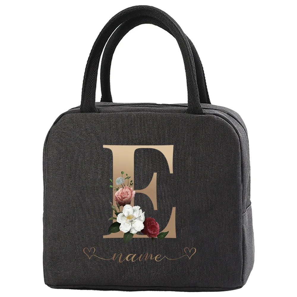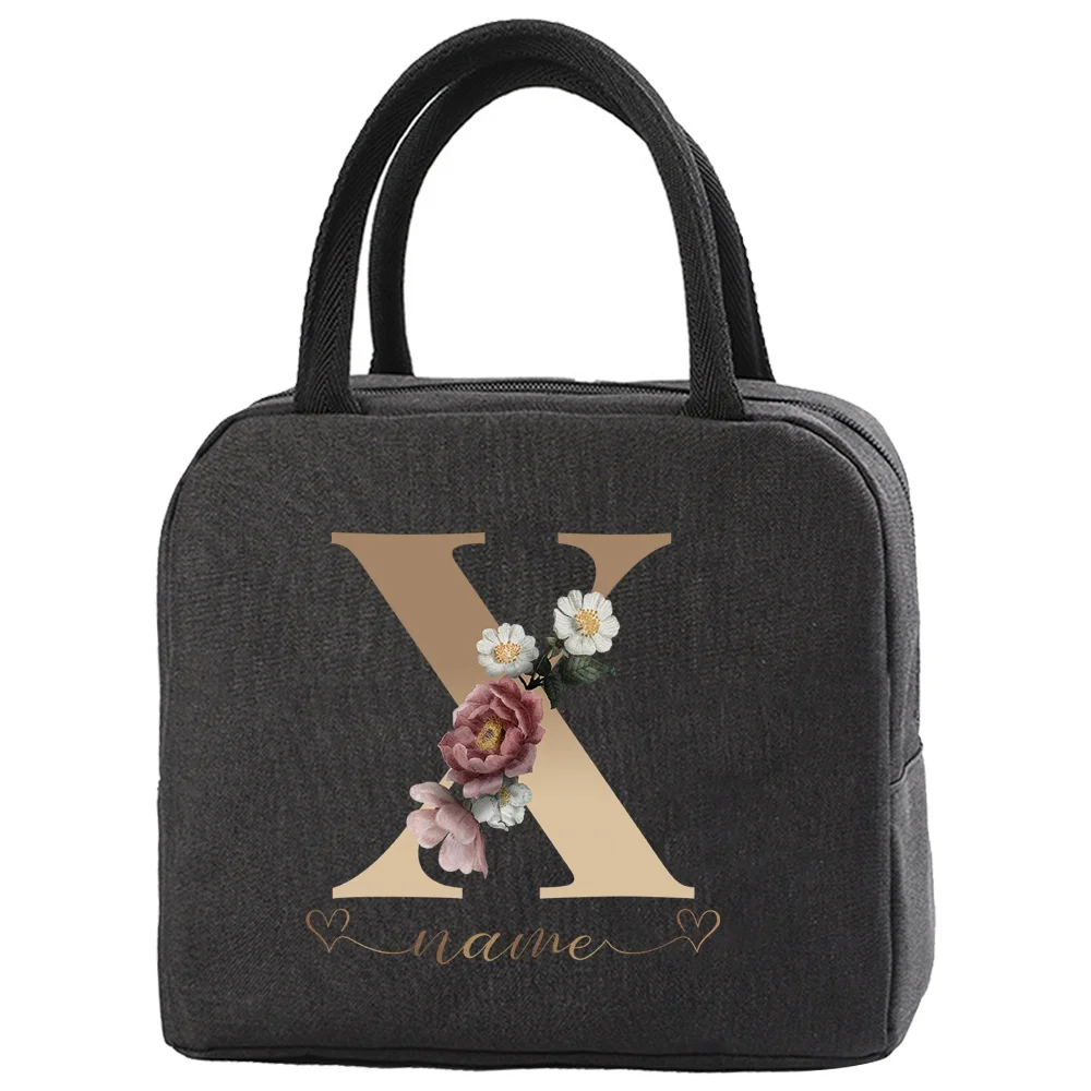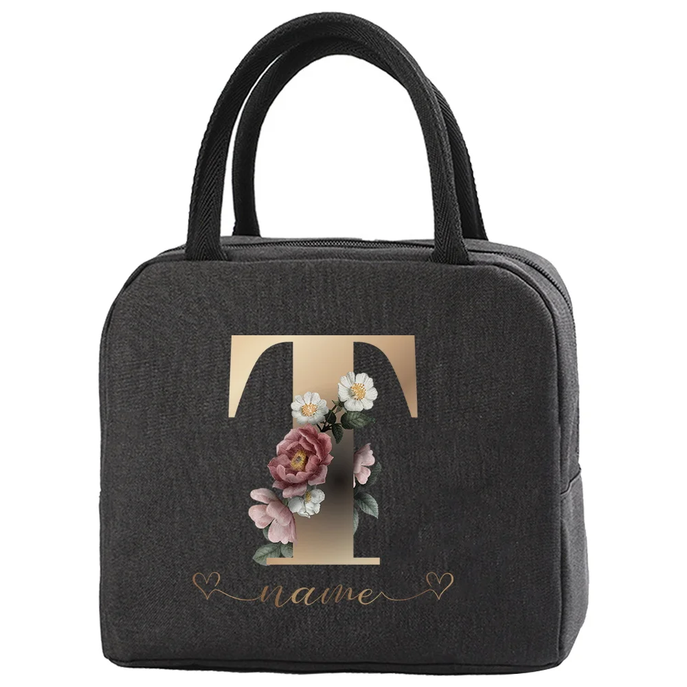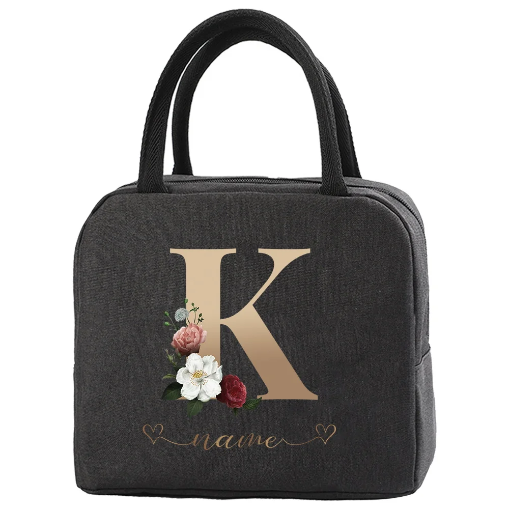 Portable Lunch Box Insulated Canvas Lunch Bag Customized Name Gold Letter Handbag Thermal Picnic Food Bags for Women Kids