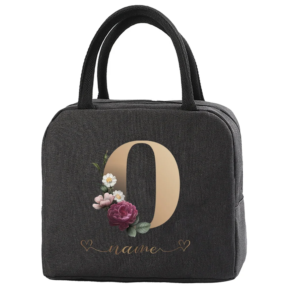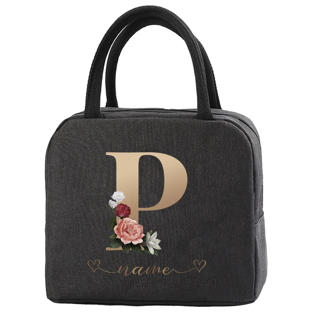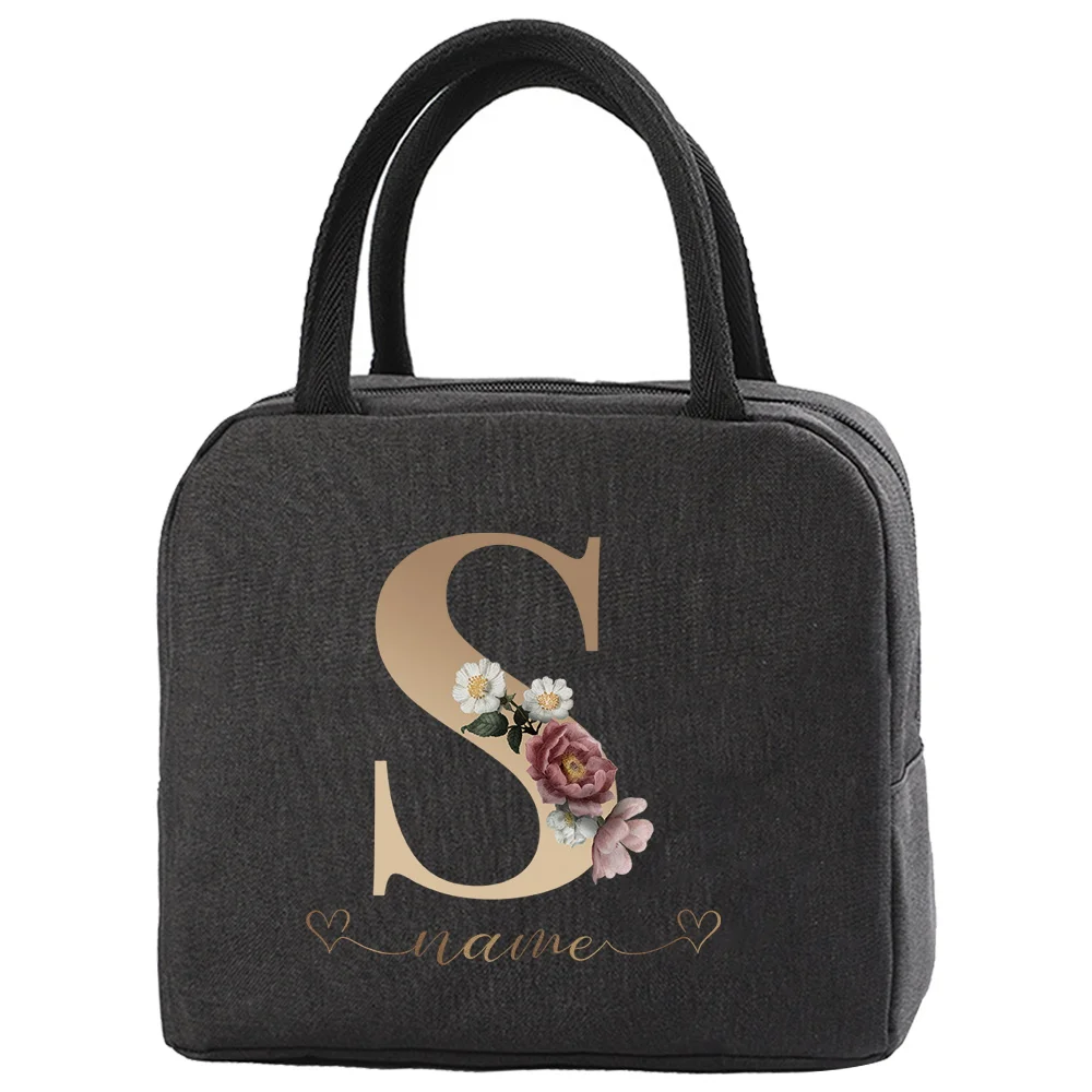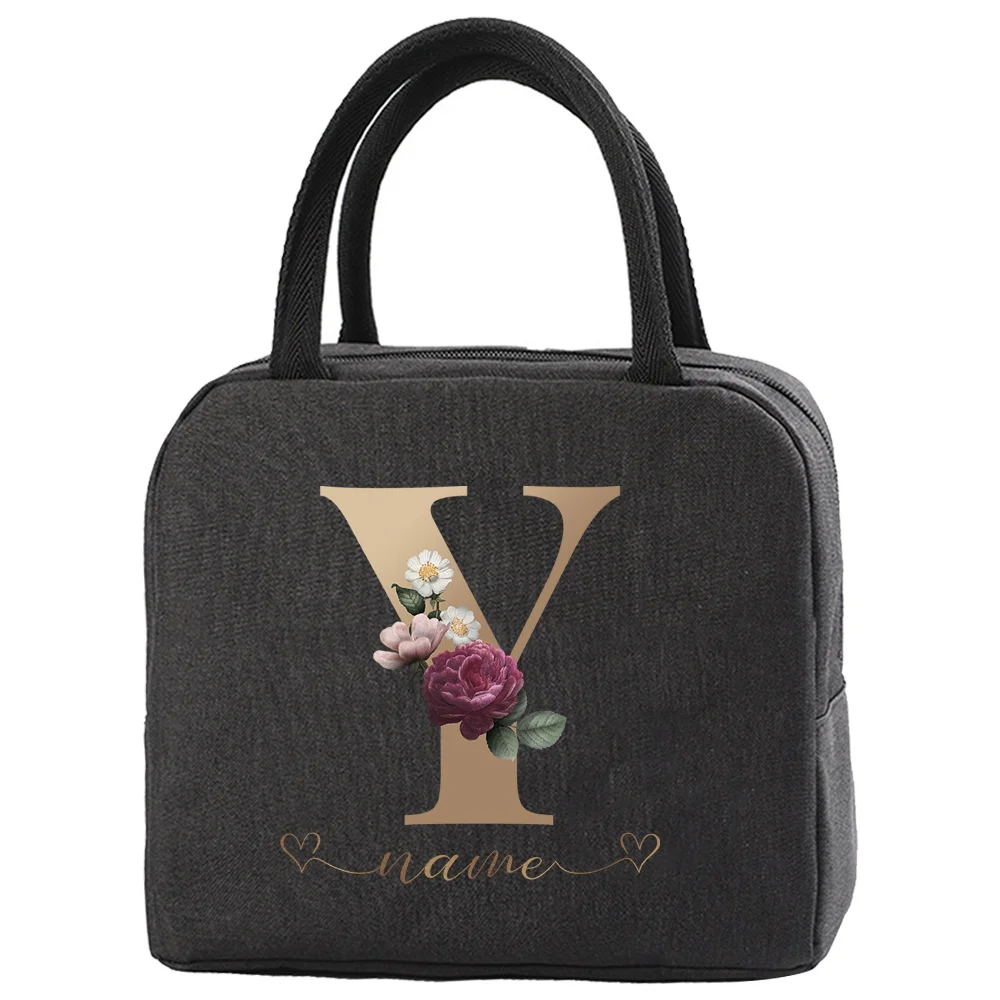 Portable Lunch Box Insulated Canvas Lunch Bag Customized Name Gold Letter Handbag Thermal Picnic Food Bags for Women Kids