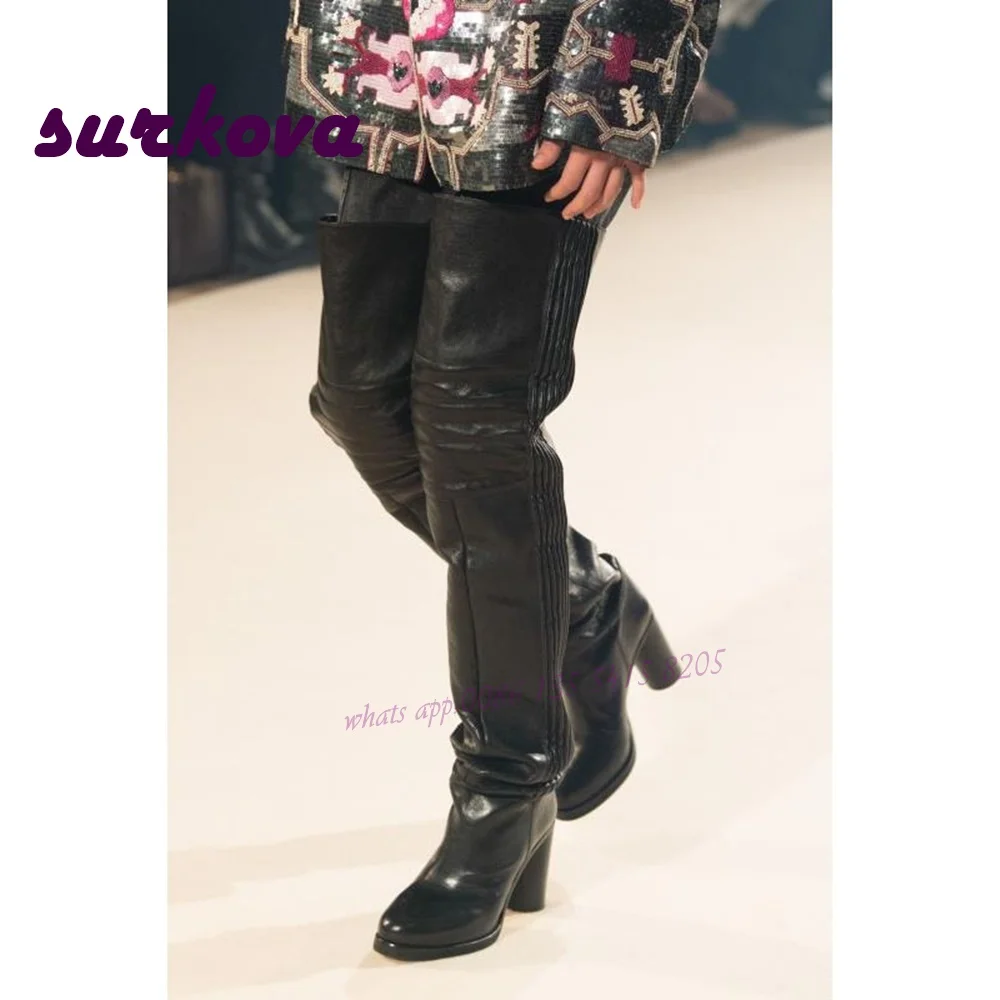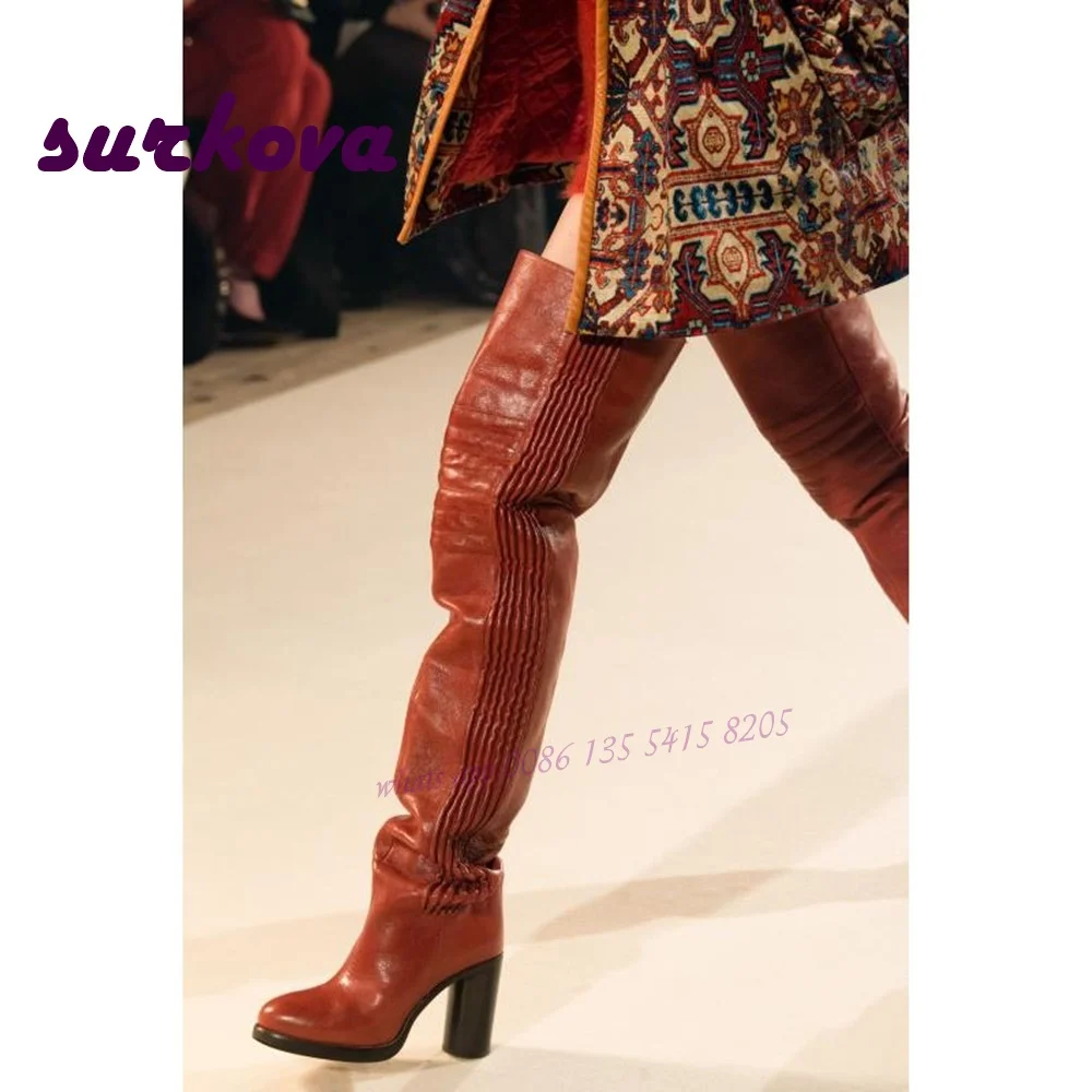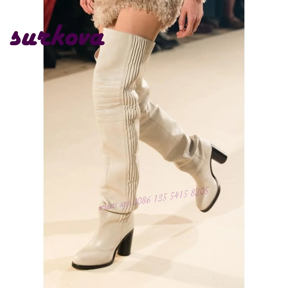 Printing Thigh High Boots Round Toe Square Heel Women's Boots Winter Pleated Leather Party Runway Shoes Street Style Knight Boot