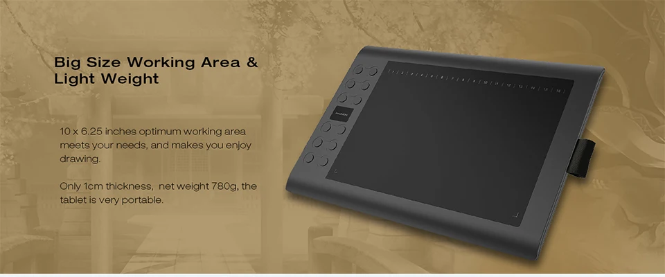 10 x 6.25 inches optimum working area is big enough for you to create, and makes you enjoy your drawing. The net weight of graphics tablet is only 780g, very portable.