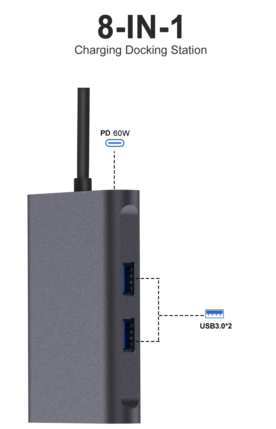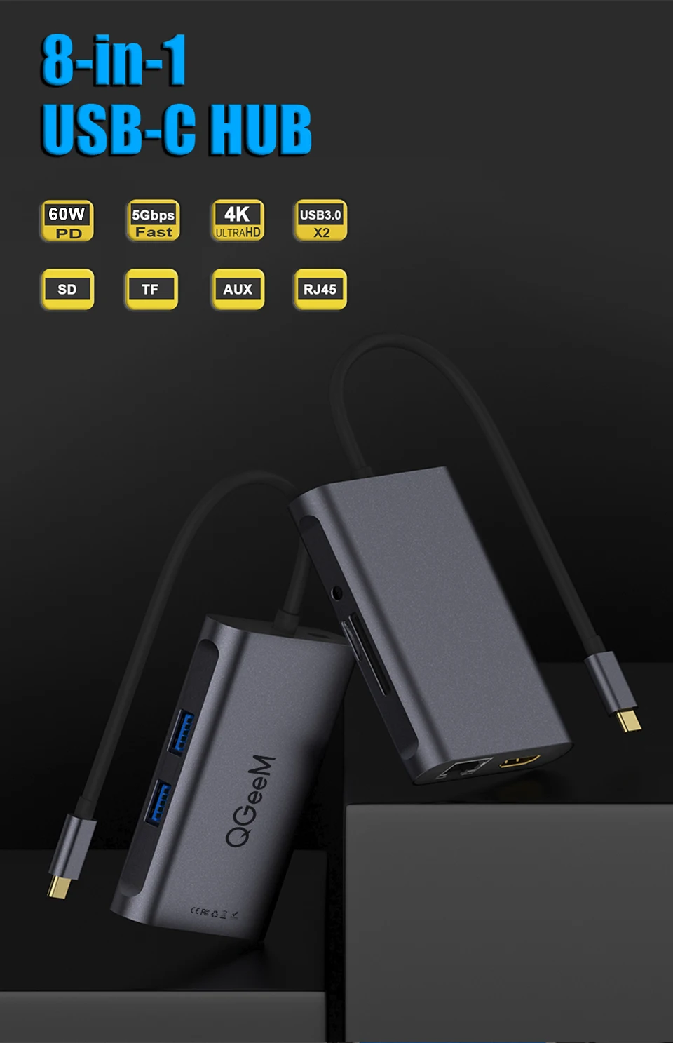 QGeeM 8 In 1 USB C Hub for Macbook Pro USB Hub 3.0 Adapter PD HDMI RJ45 TF SD 3.5mm Aux Type C Hub for iPad Pro Splitter Dock