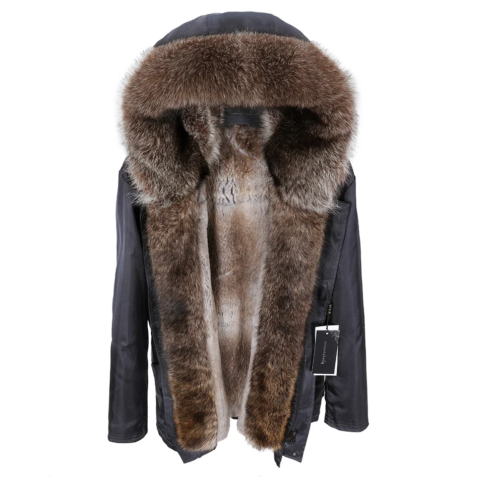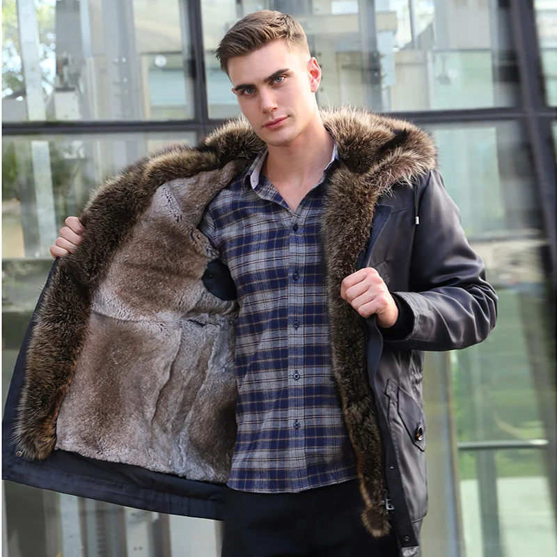 Rabbit fur lined bomber jacket men's natural winter coat locomotive real fur coat leather real raccoon fur parker