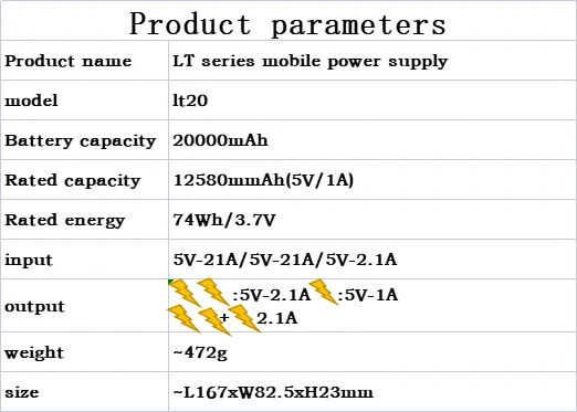 LT20 with 3 input and 2 output ports are able to charge 2 different mainstream smartphones and digital devices simultaneously.