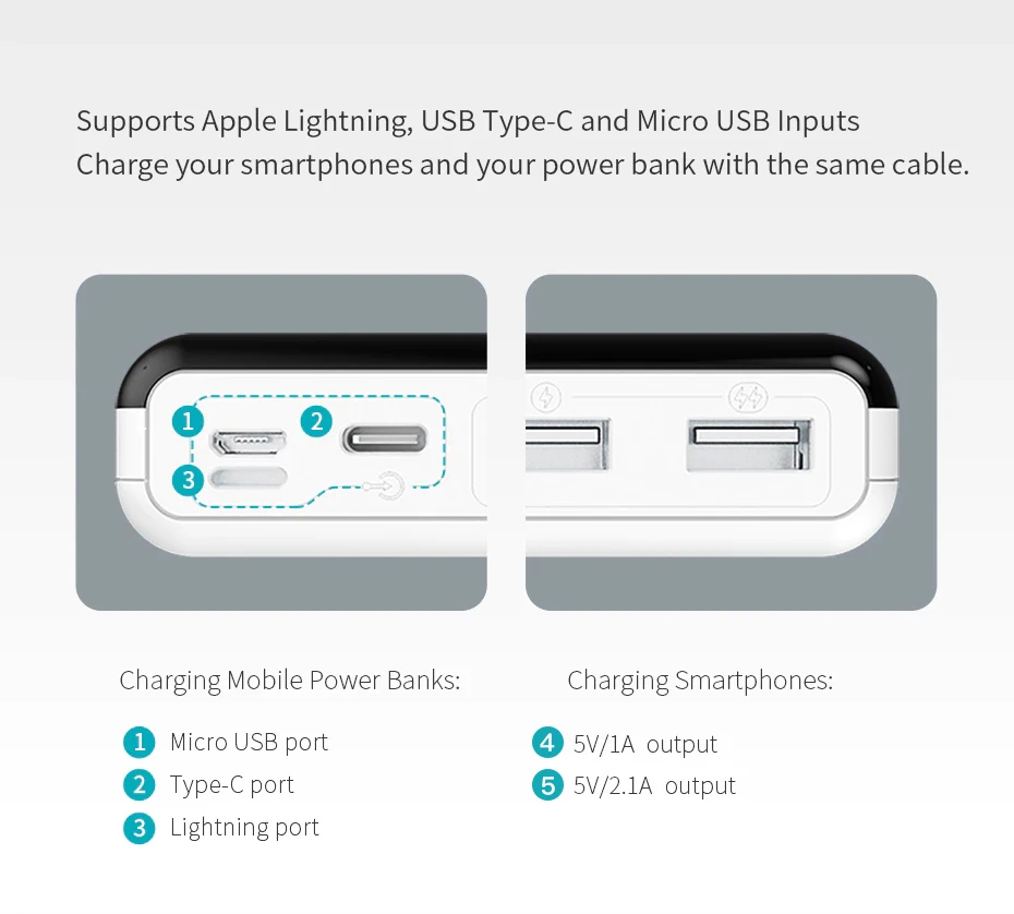 3-input: Micro-USB, lighting and Type-C provides high convenience of recharging this power bank with any of these 3 widely used cables. 2-Output: 2 USB outputs enable to charge a mobile phone, a tablet or for Nintendo Switch simultaneously.