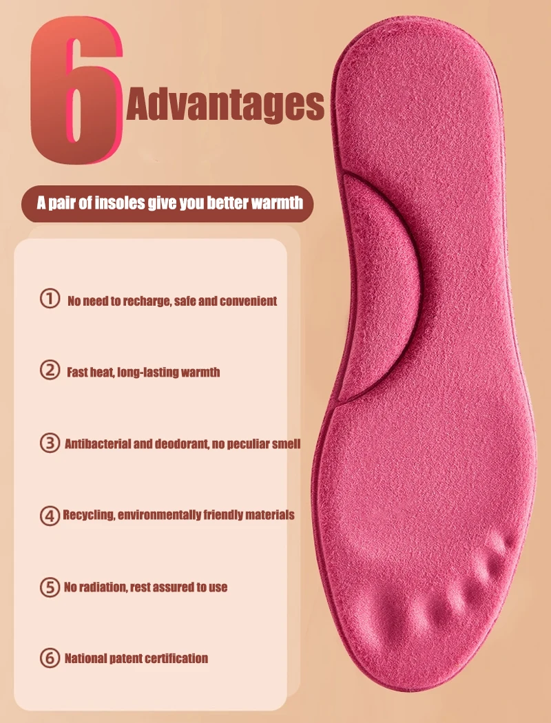 Nano gene heating constant temperature insole.The nano-gene embedded in the insole can effectively absorb the energy in the environment and quickly convert it into heat and far-infrared,and conduct and penetrate from the surface to the inside.It produces a warming effect and also resonates and resonates with the tissue cells of the foot,which promotes Cell activity can relieve fatigue and accelerate metabolism.At the same time,it can effectively decompose bacteria and other microorganisms in the feet to create a healthy foot environment.Warmth,no lint,no ball,antibacterial and deodorant,strong air permeability,soft and comfortable,durable.