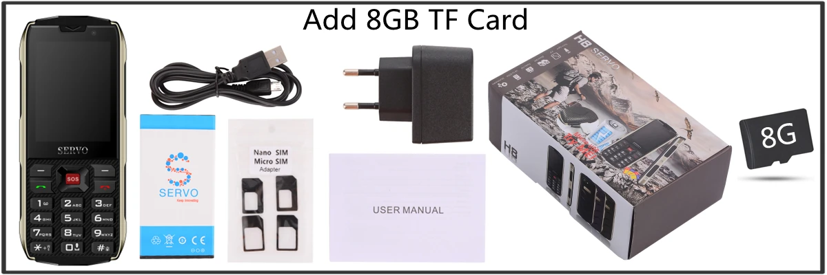 1 x Phone,1 x Box ,1 x USB Cable ,1 x Manual ,1 x Battery,1 x Charger,1 x 8GB Memory card