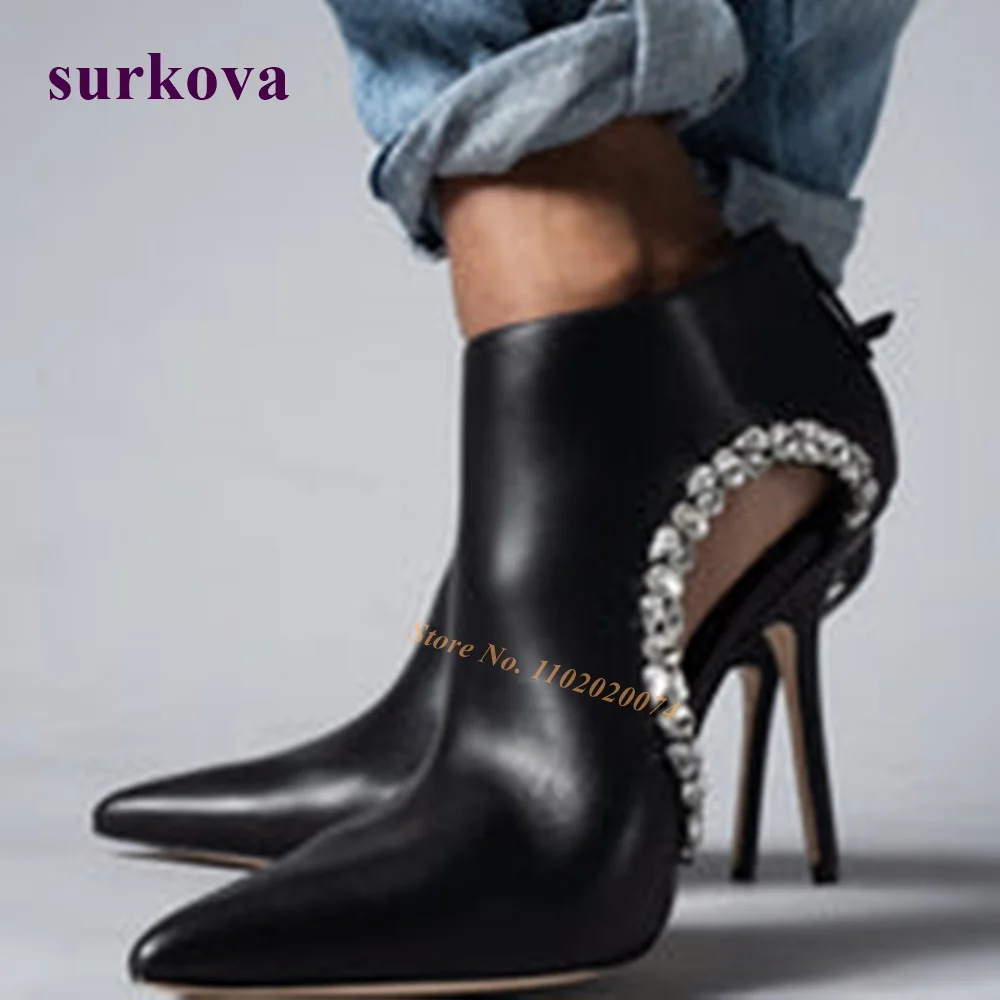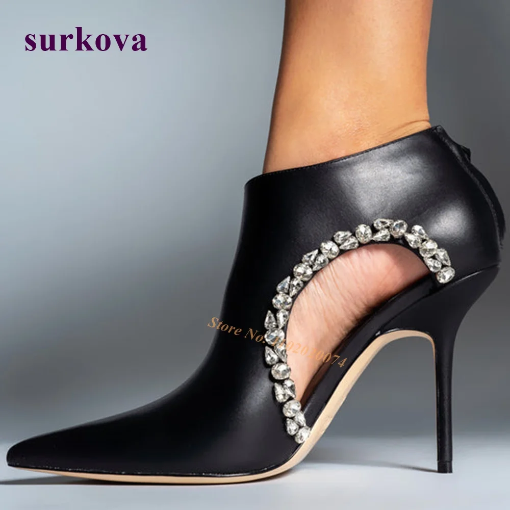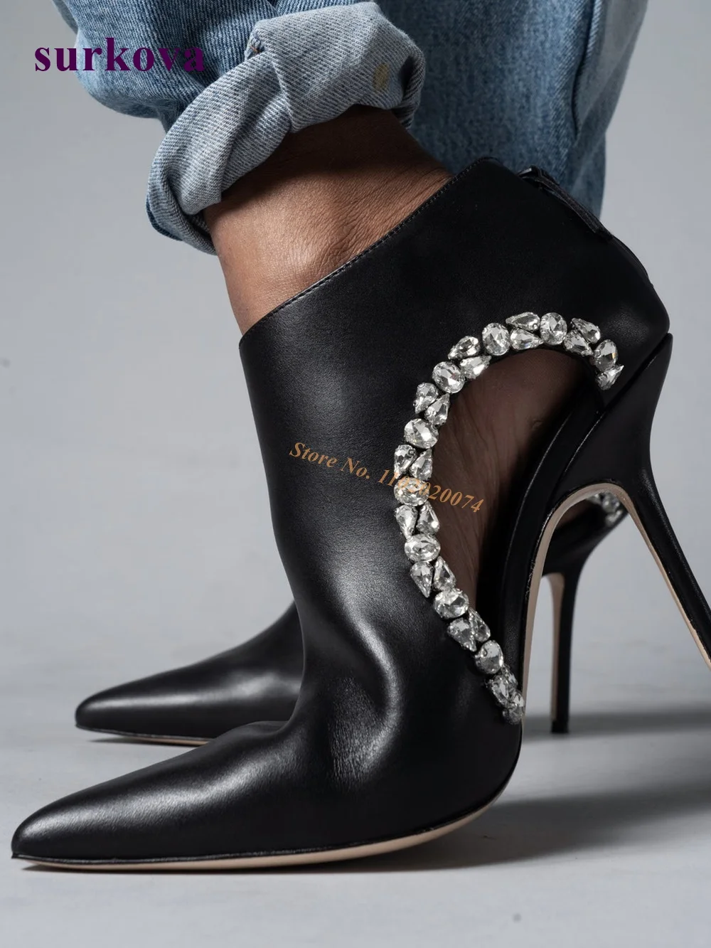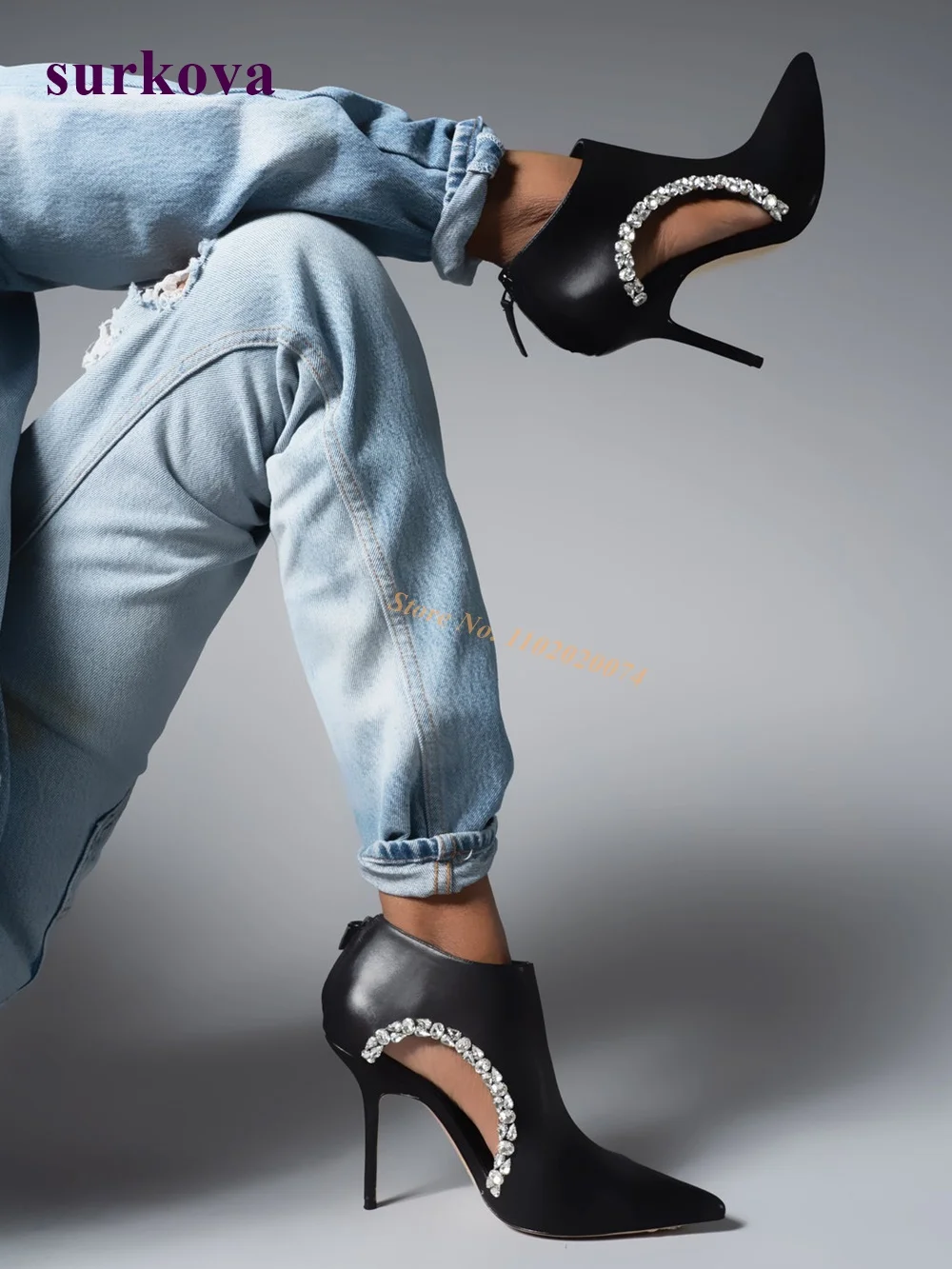 Basic Information About The Shoes:Side Air Crystal Ankle Boots Pointed Toe Leather Stiletto Heels Back Zip Solid Nude Luxury 2022 New Designer Party Wedding Shoes