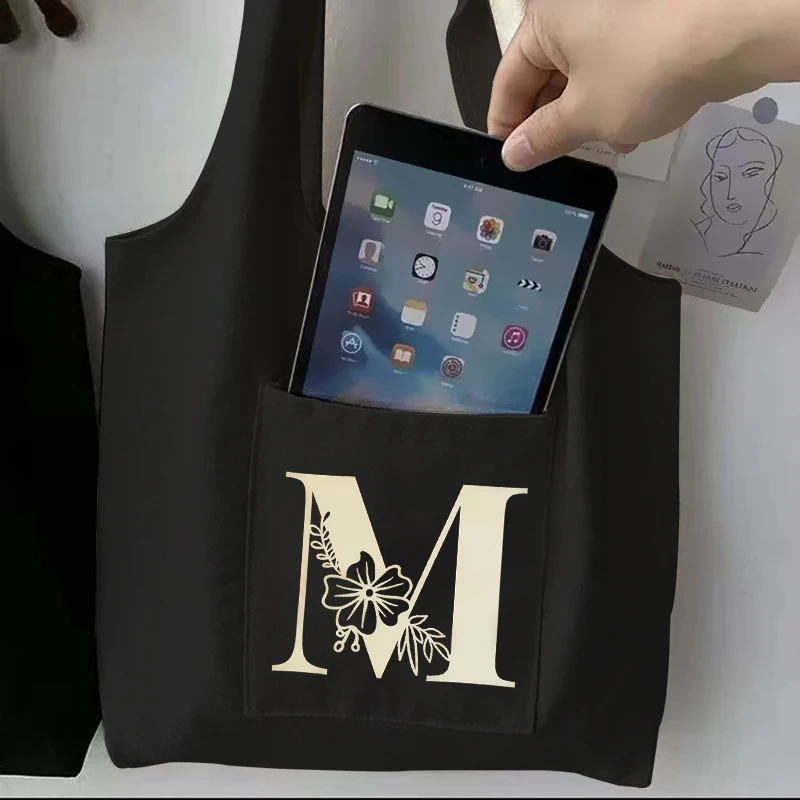 Simple Gold Letter Print Shopping Black Bags Canvas Tote Bag Printed Cartoon Reusable Cloth Bag Handbag Shoulder Bags Custom