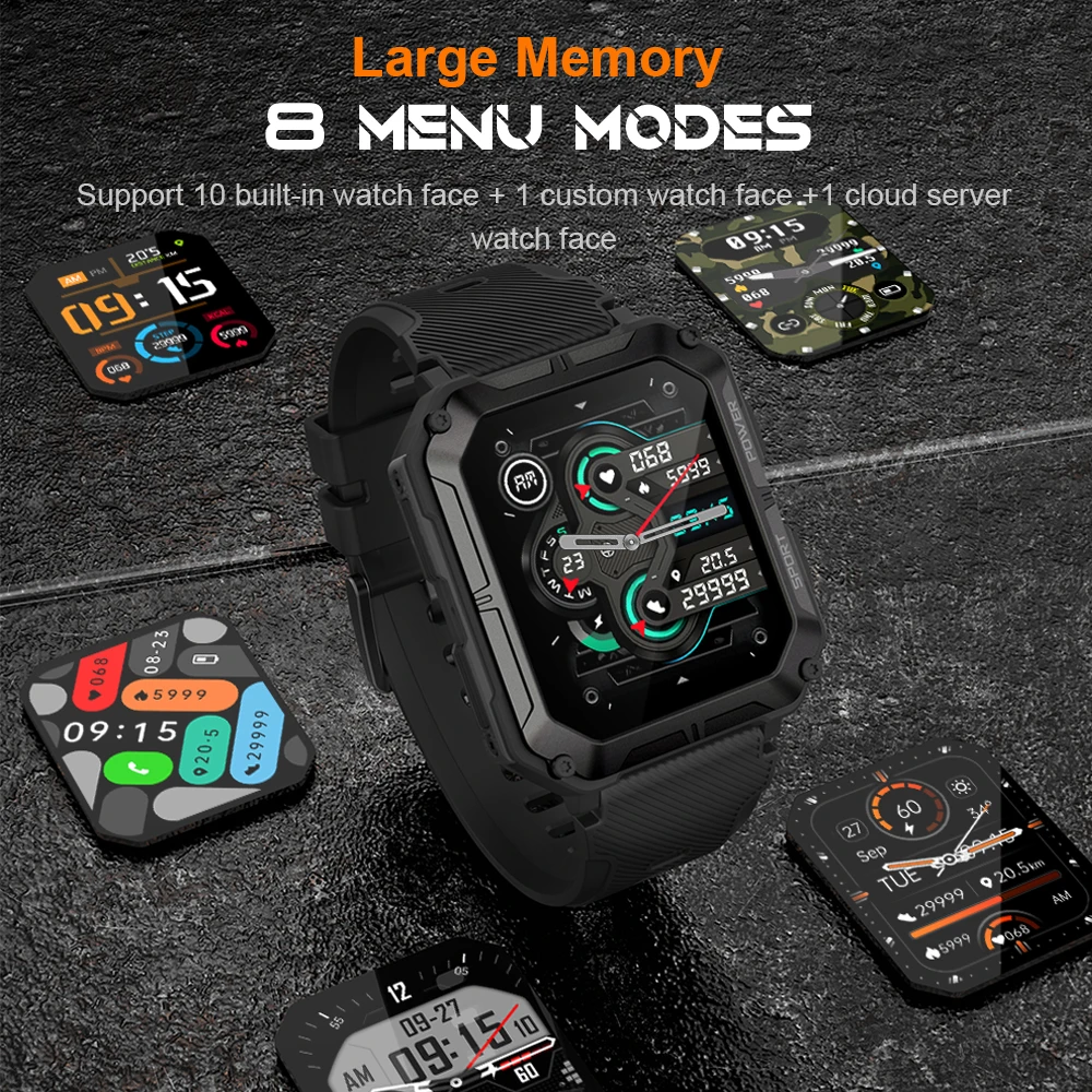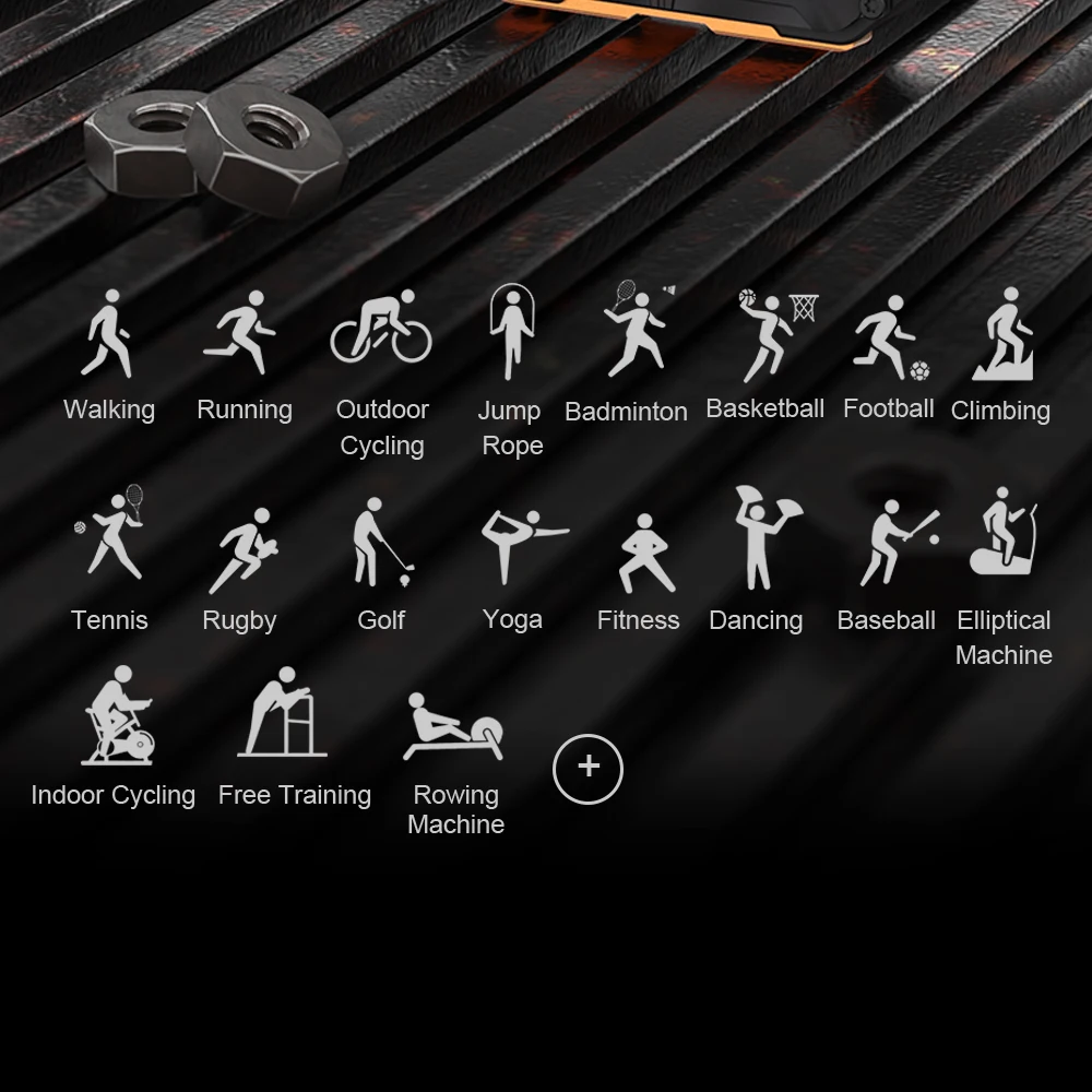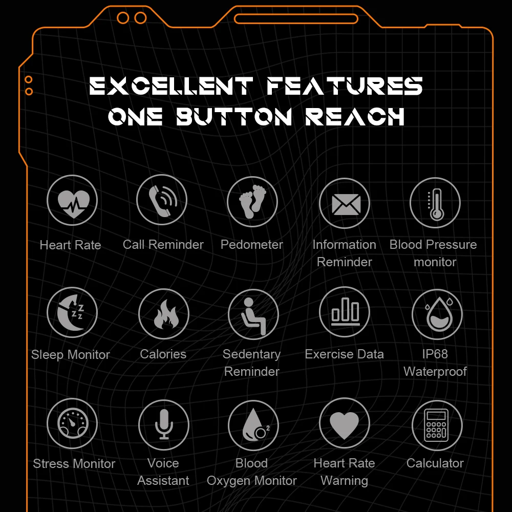 Dial, Favorite Contacts, Call History, Step Counter, Sleep, Heart Rate, Exercise, Blood Pressure, Weather, Camera Control, Blood Oxygen, Music Control, Stopwatch, Alarm, Timer, Sedentary Reminder, Breathing Training, Calculator, Messages, Brightness adjustment, mute, QR code, quick center, mobile phone search, heart rate warning, voice assistant, stress monitor