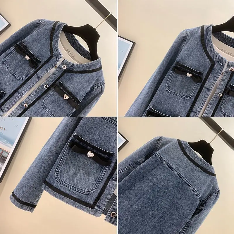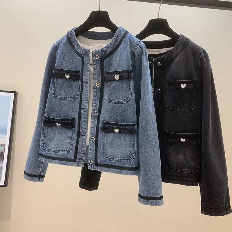 Small Xiangfeng Denim Coat Women's Spring and Autumn 2023 New Bow Slim Korean Jacket Round Neck Short Top
