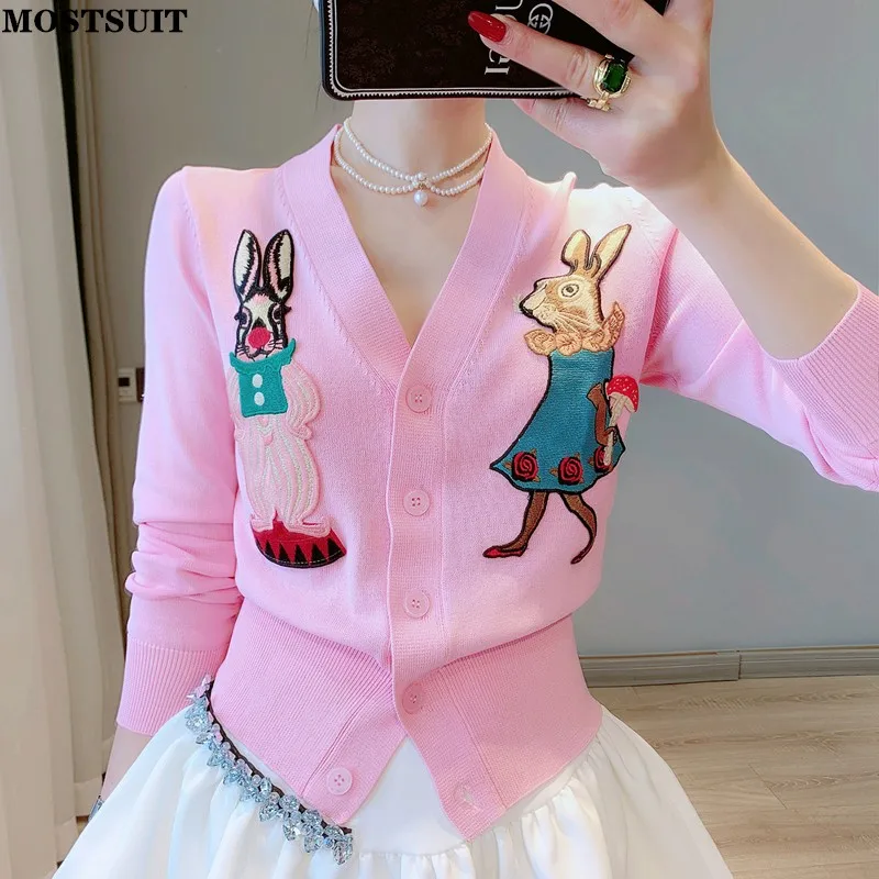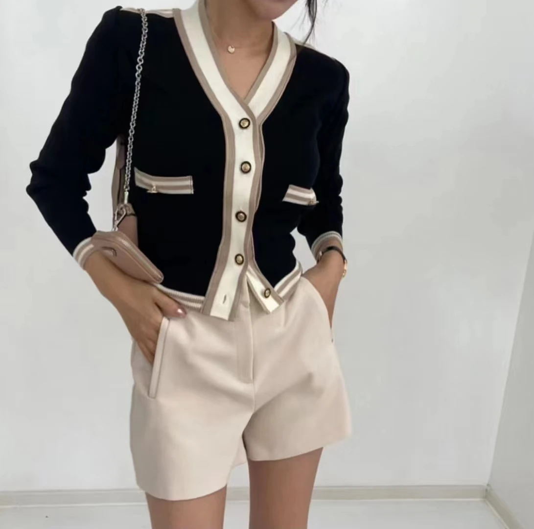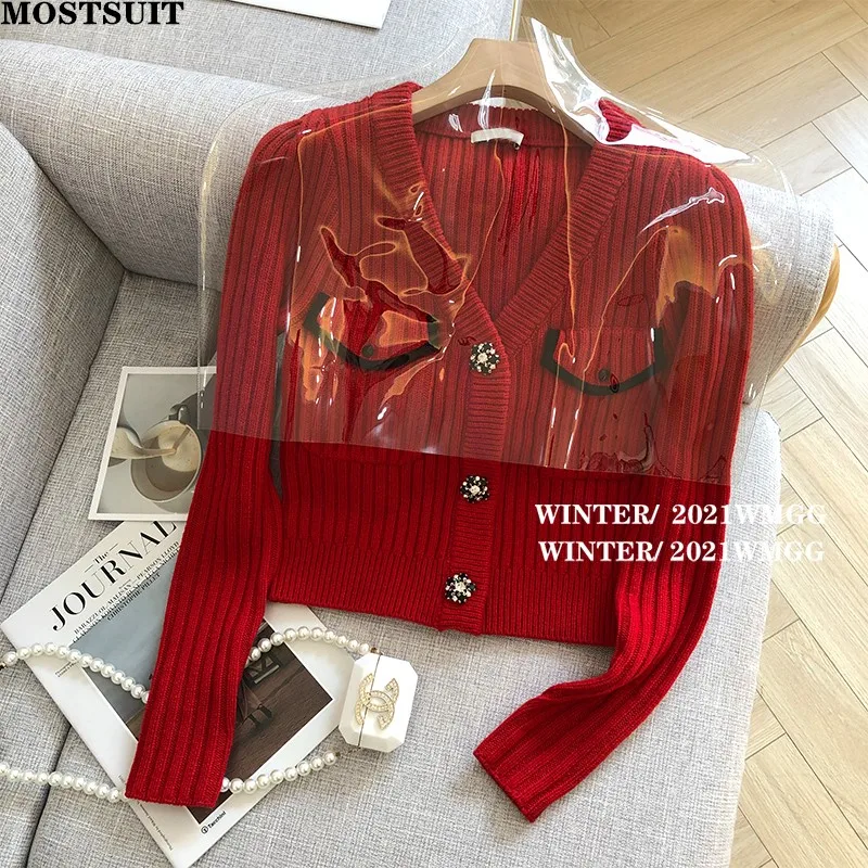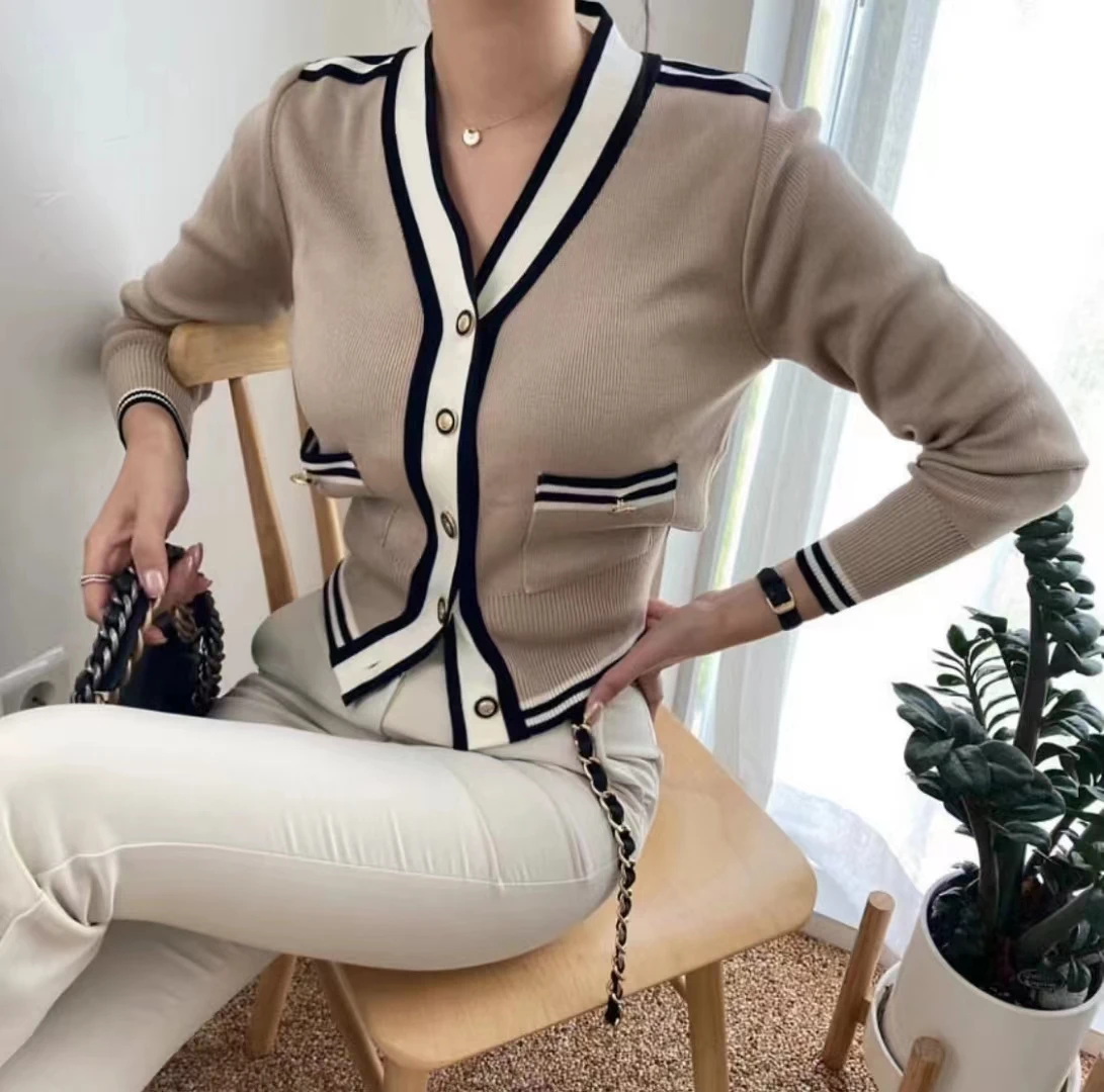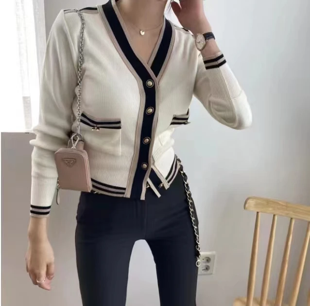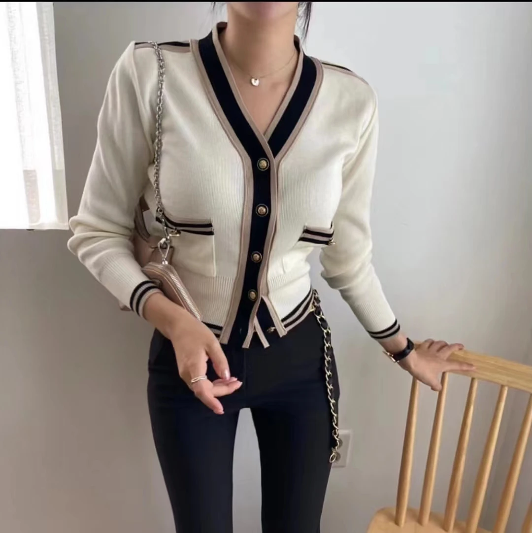 Striped Edge Korean Chic Knitted Sweater Cardigan Women Vintage Workwear Ladies Tops Knitwear Long Sleeve V-neck Jumpers 2022