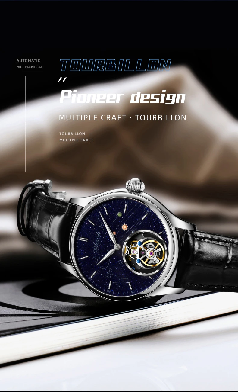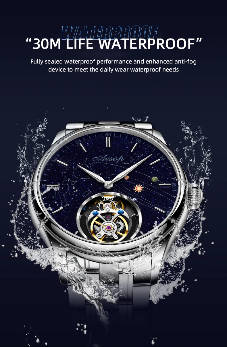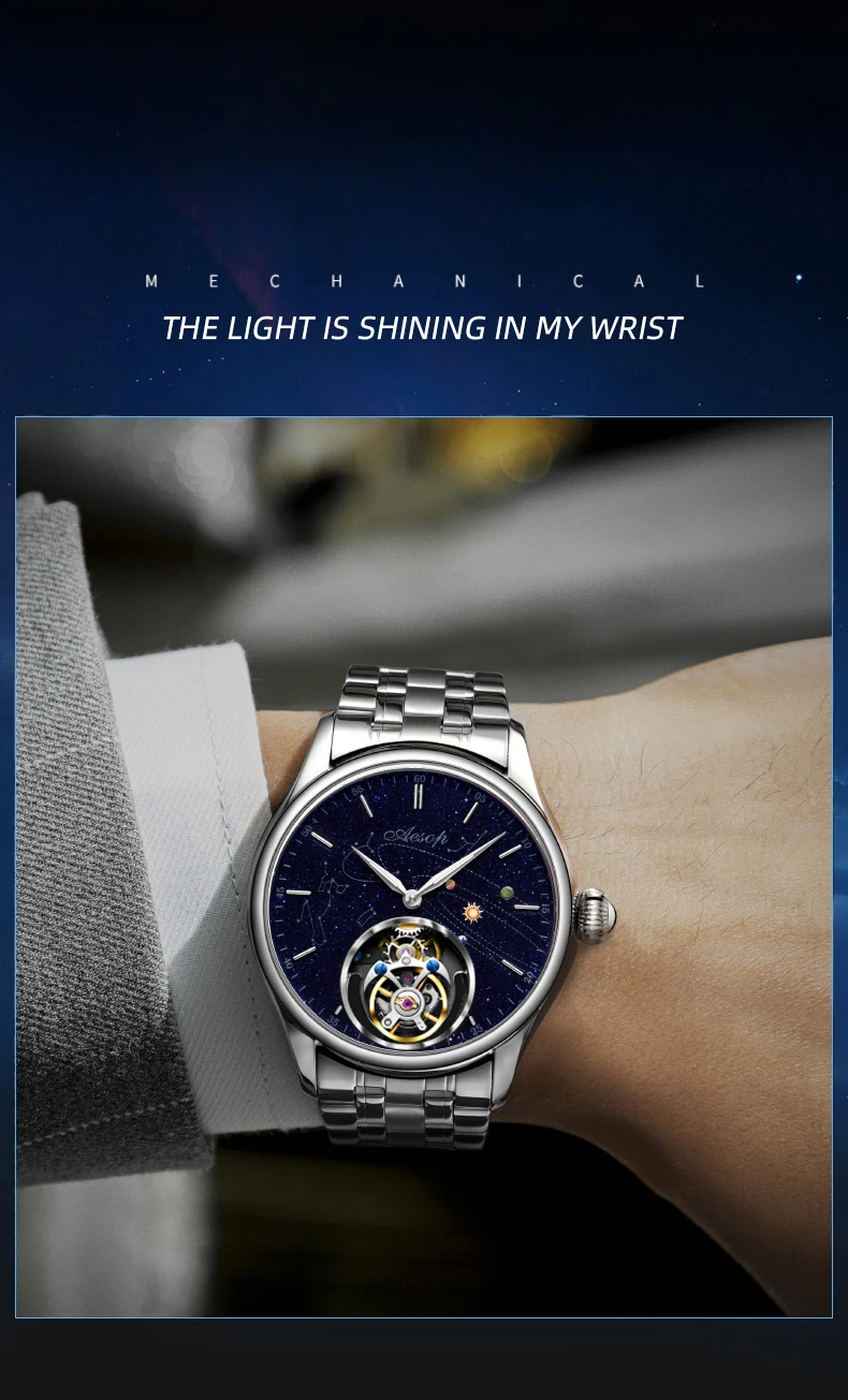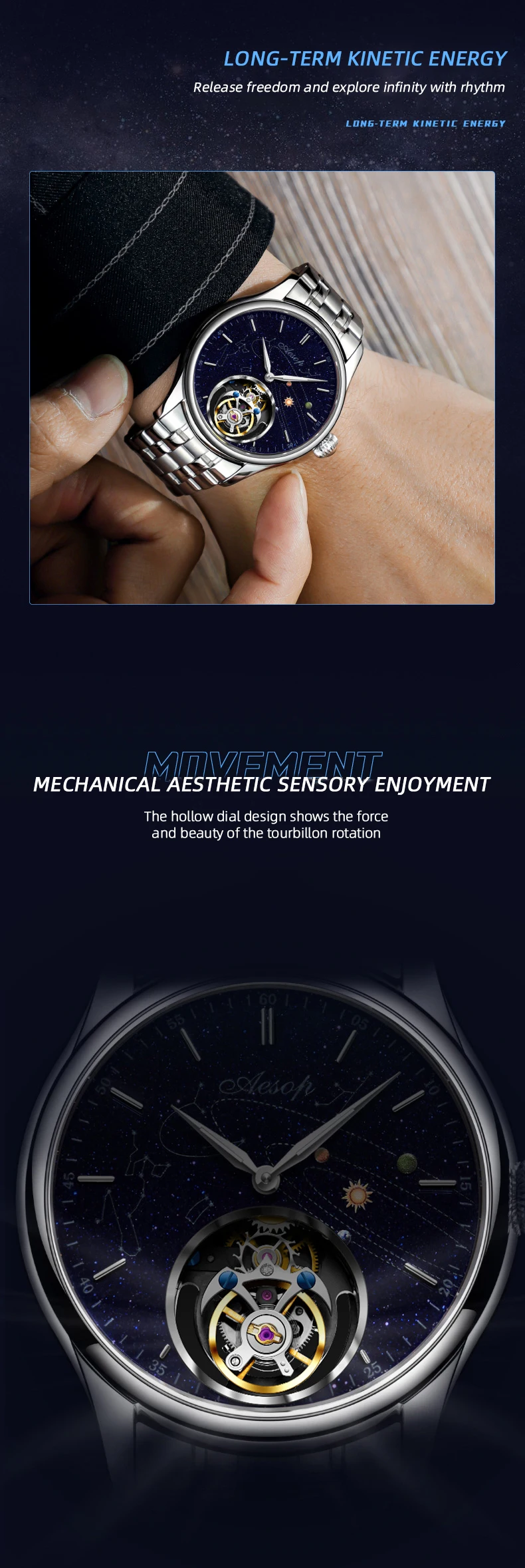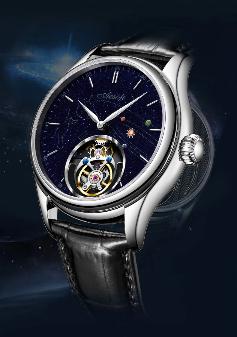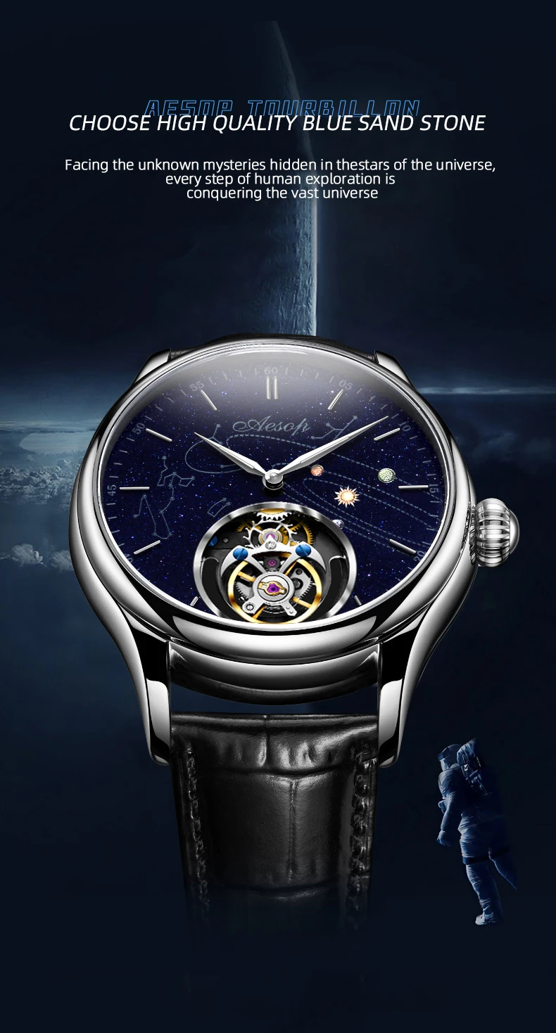Super AESOP Flying Tourbillon Watch for Men Milky Way Star Sapphire Dial Luxury Steel Band Male Mechanical Wrist Watches 1963