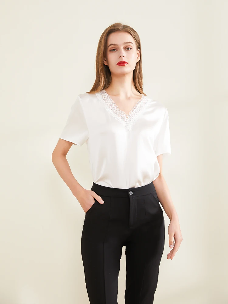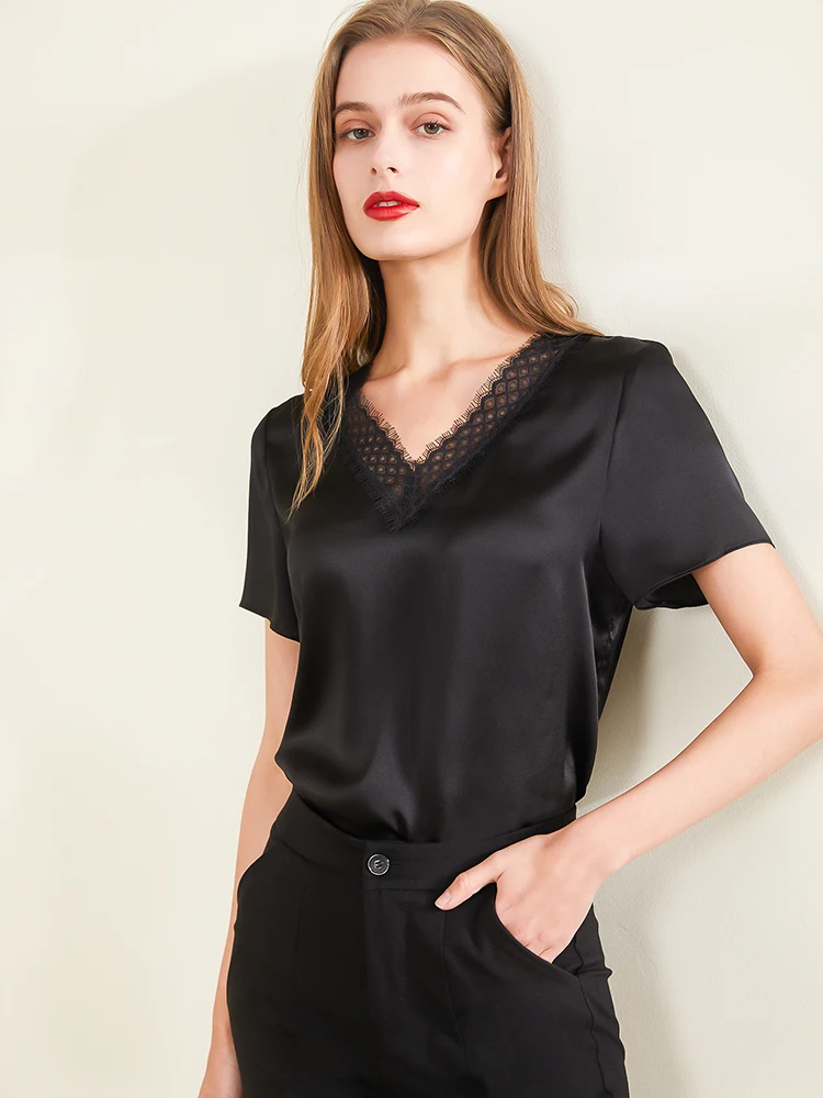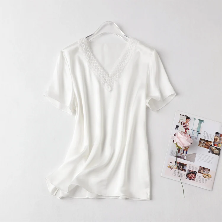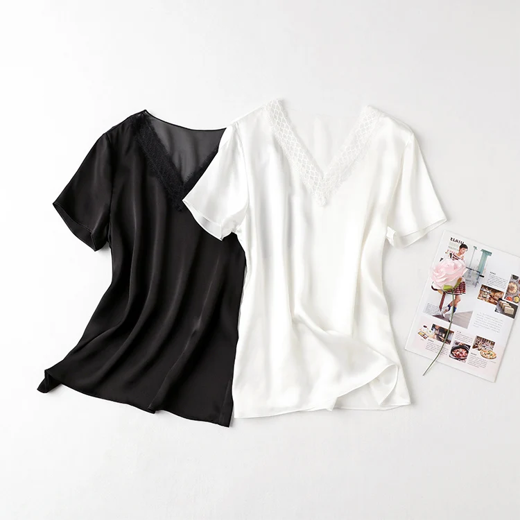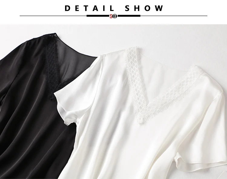 SuyaDream Women White T Shirt 100%Real Silk Short Sleeves Lace V neck Blouse Spring Summer Black Top