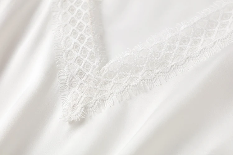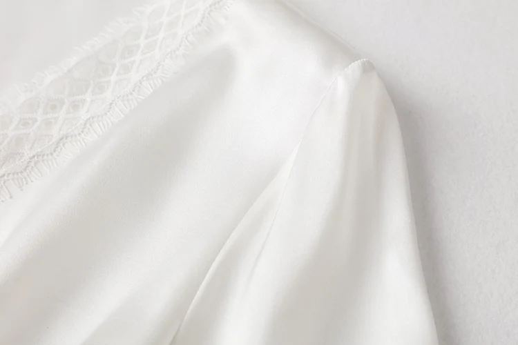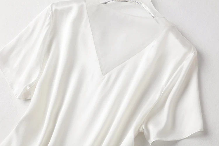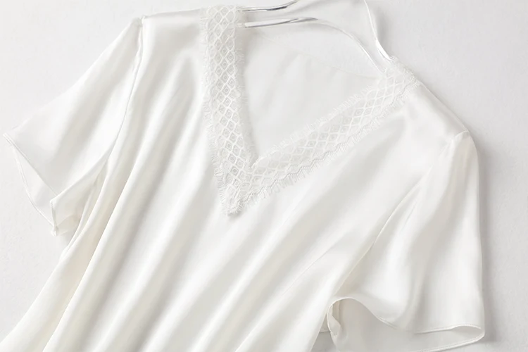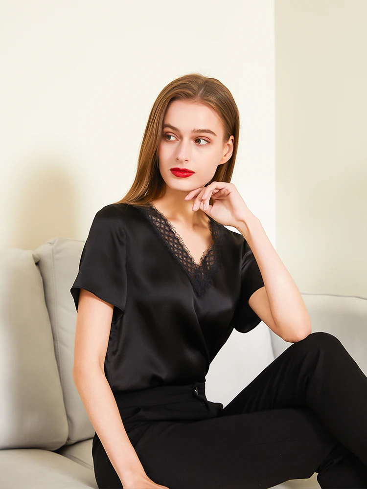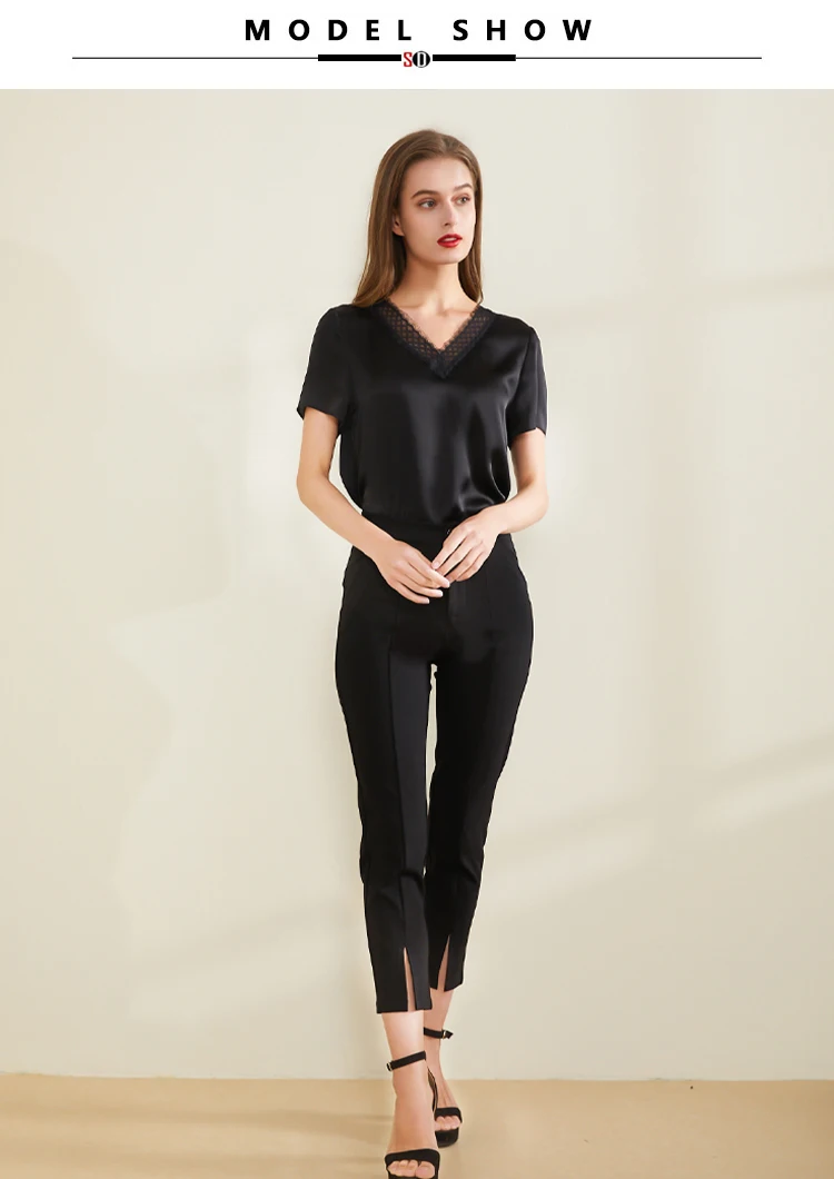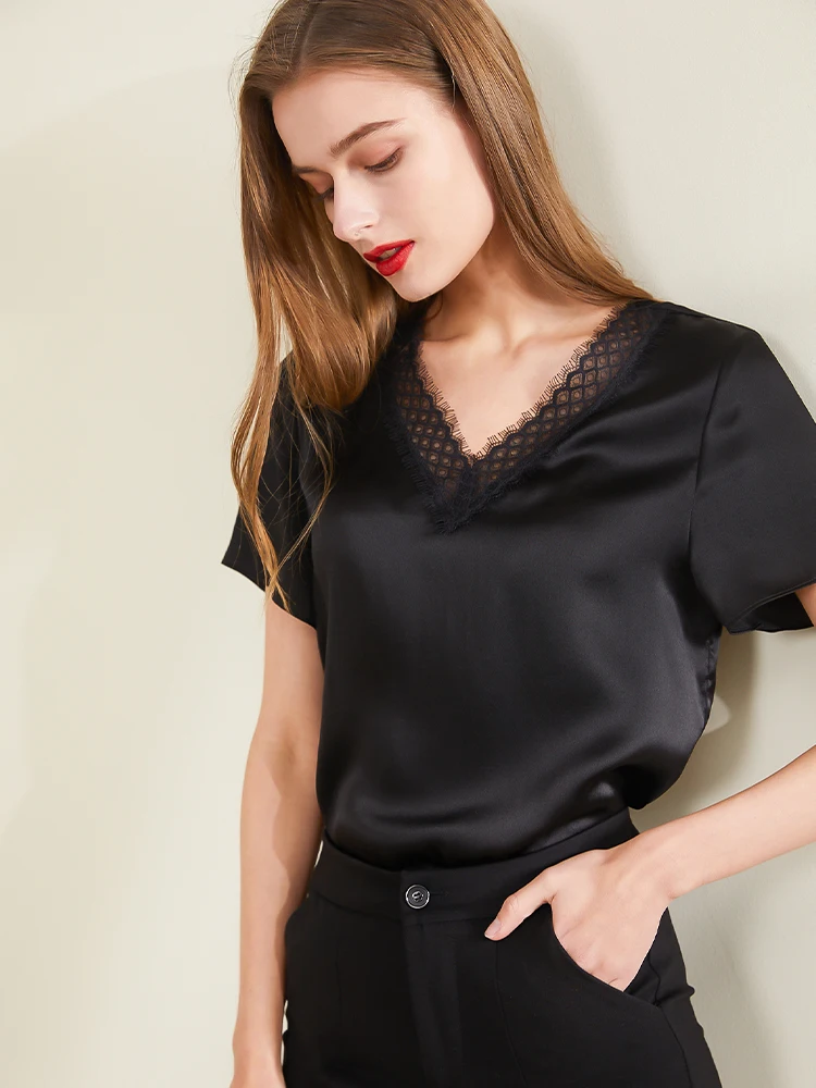 SuyaDream Women White T Shirt 100%Real Silk Short Sleeves Lace V neck Blouse Spring Summer Black Top