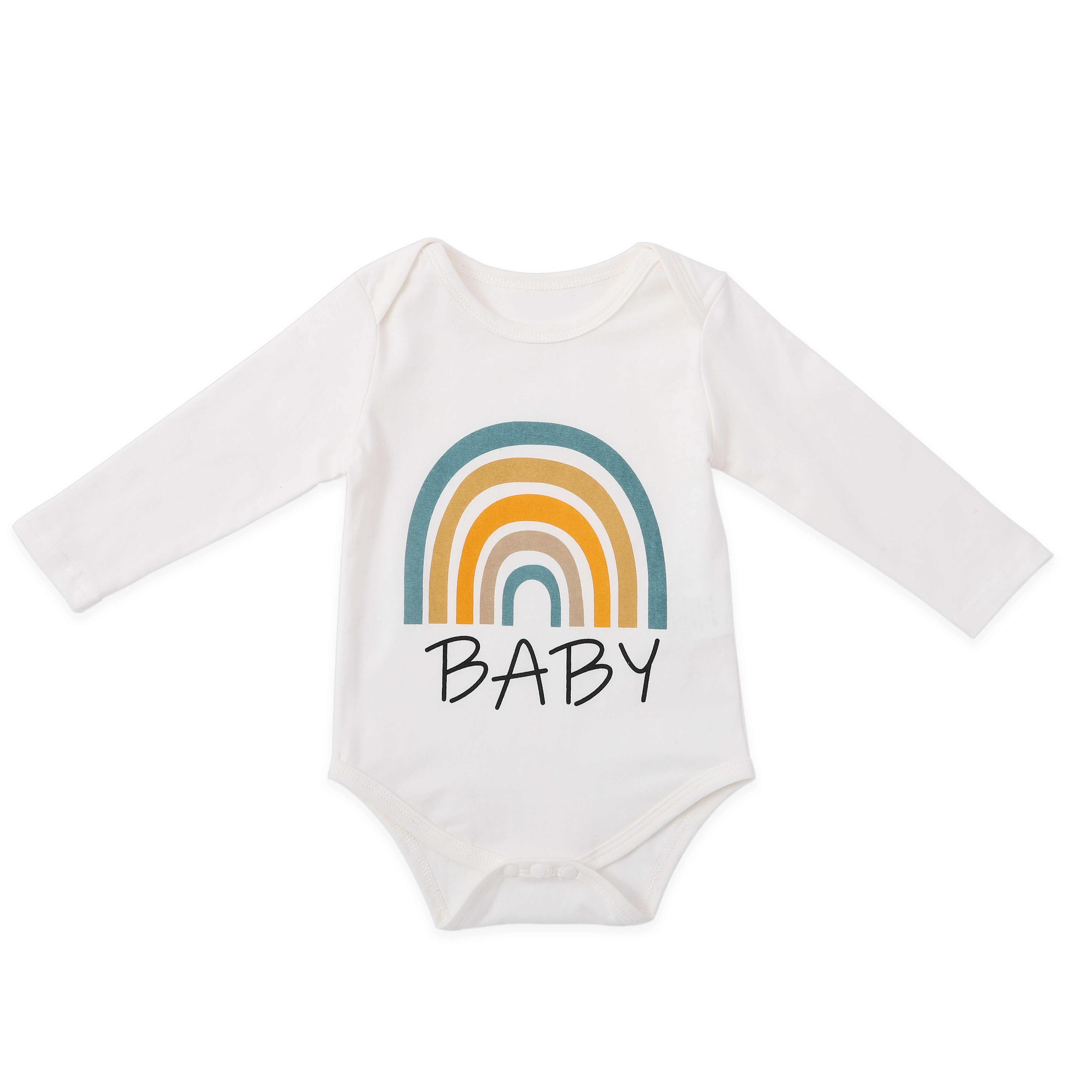 Celebrate your rainbow baby with this sweet bodysuit featuring a quirky rainbow. This sweet piece is the perfect light layer for baby. The hues are in various shades of neutral shades.