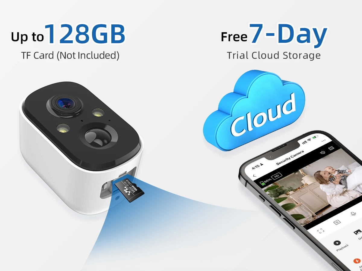 This wireless security camera has dual storage mode, SD card (up to 128G, not included), or cloud storage service (free 7-day trial).