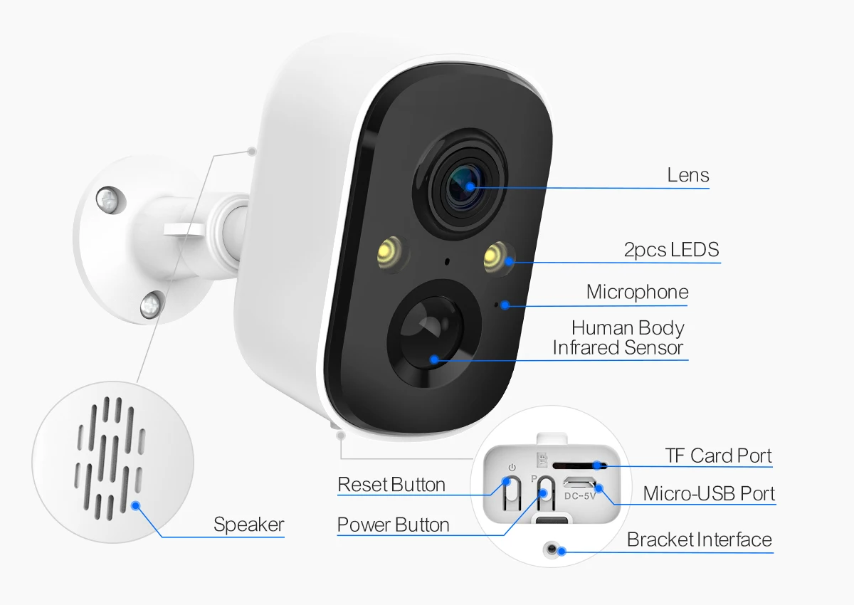 The wireless outdoor camera utilizes 25% high conversion rate monocrystalline silicon 1.6W solar panel and a built-in 4500mAh large capacity rechargeable battery.