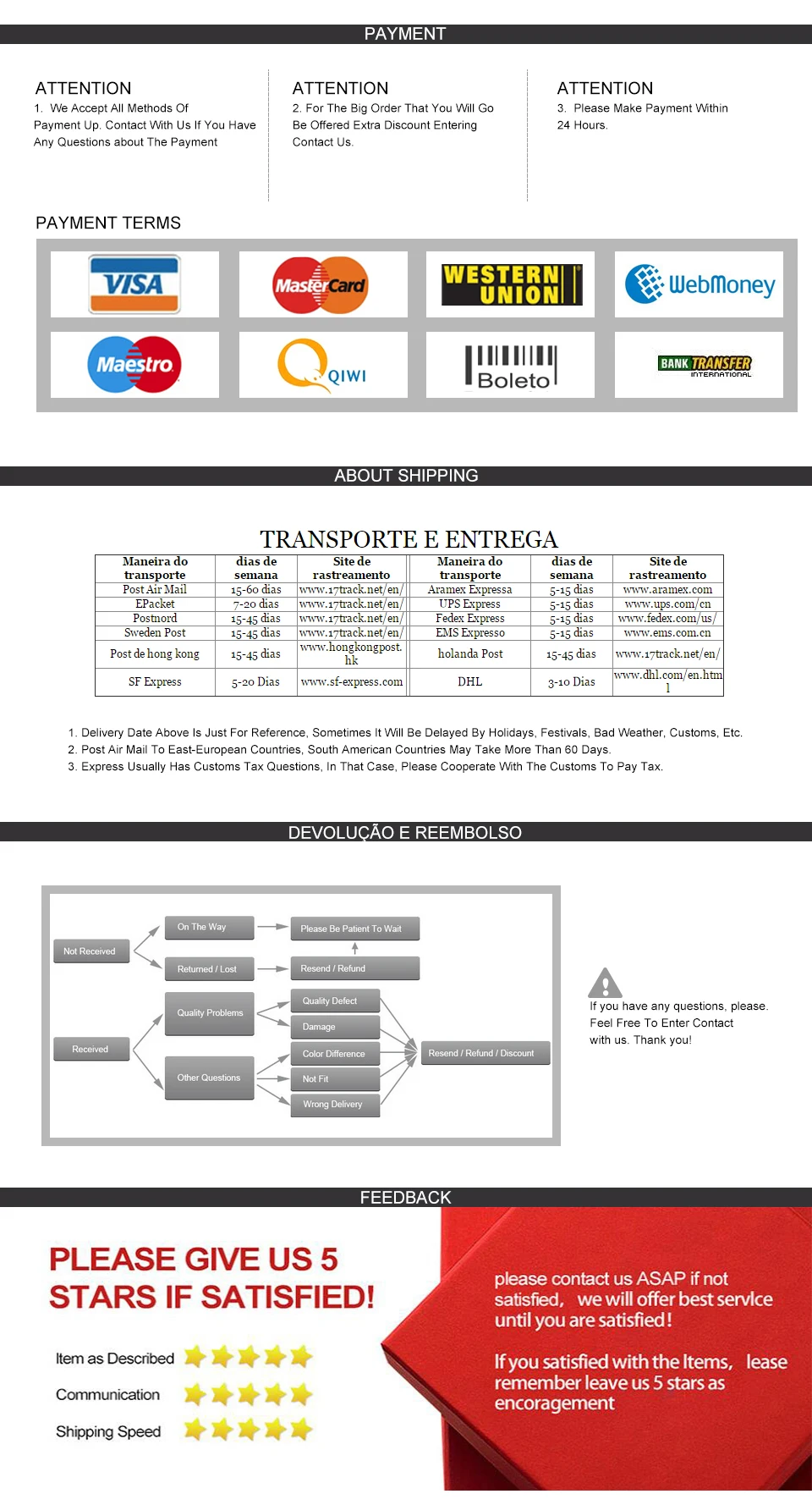2.Please leave a Positive Feedback and 5 Stars if you are satisfied with the items. We will appreciate it if you can post pictures of items.