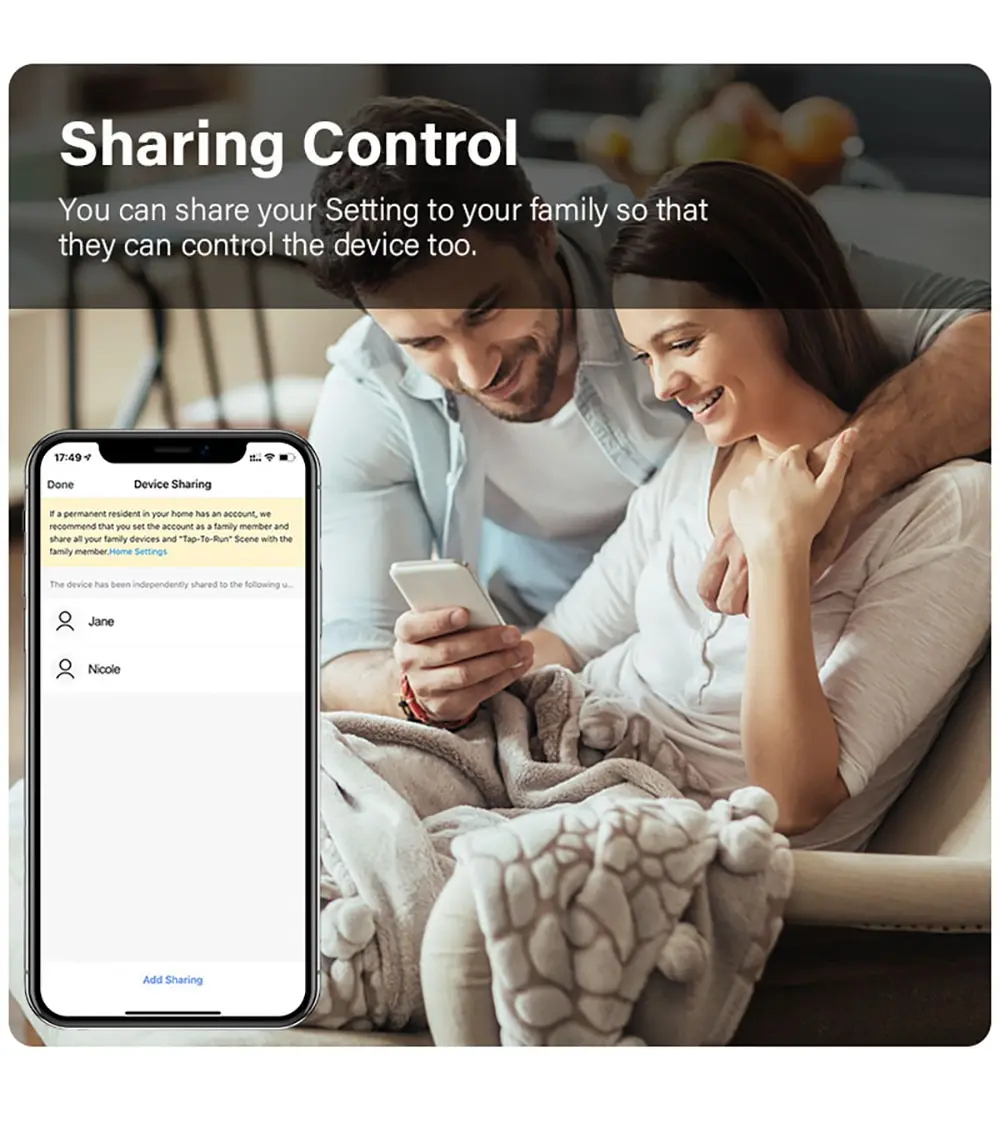 The main account can be shared with other family members, and the functions and settings are completely retained and copied; security: once the main account adds a light, the light will be hidden and other users can no longer find and add; it needs to be actively shared before others can use it it.