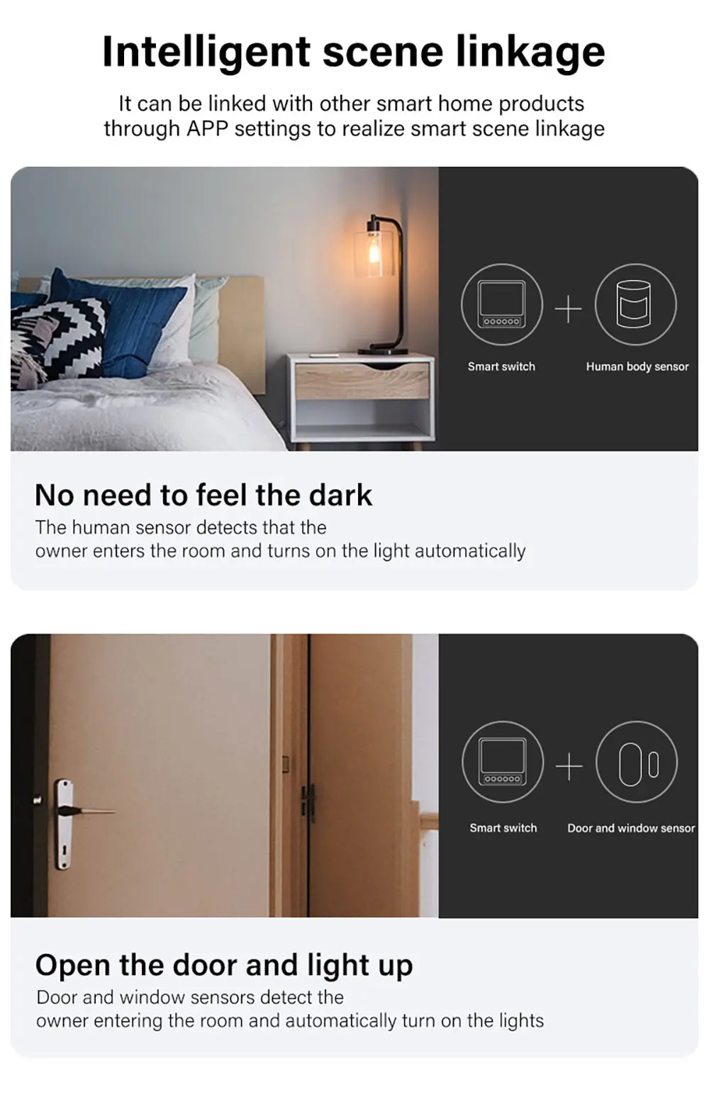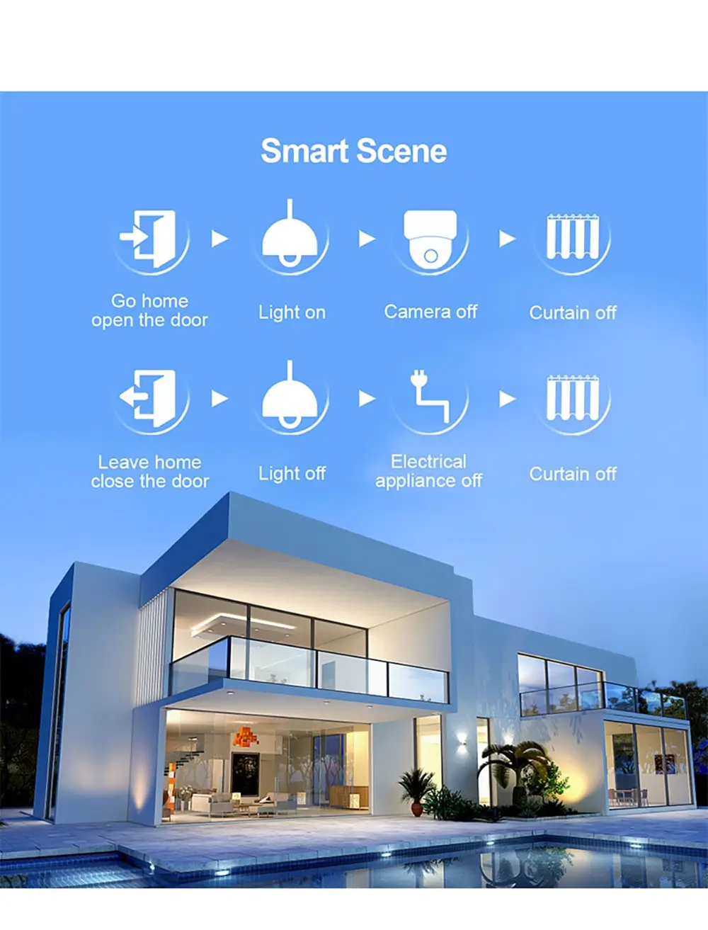 Through settings, it can be linked with other smart scenes to make life smarter; for example, set the home scene: automatically turn on the living room lights, TV, and air conditioner.