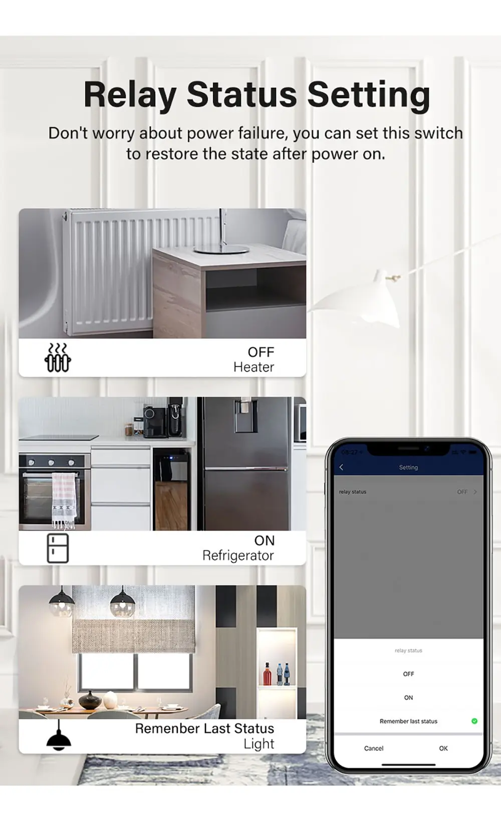 Resume the power after the power failure, without worrying about the change of the equipment state, and maintain the state before the power failure. It was in the open state before the power was cut off, and the open state is automatically restored when the power is turned on again. (Can be set to open, close, power off memory mode)