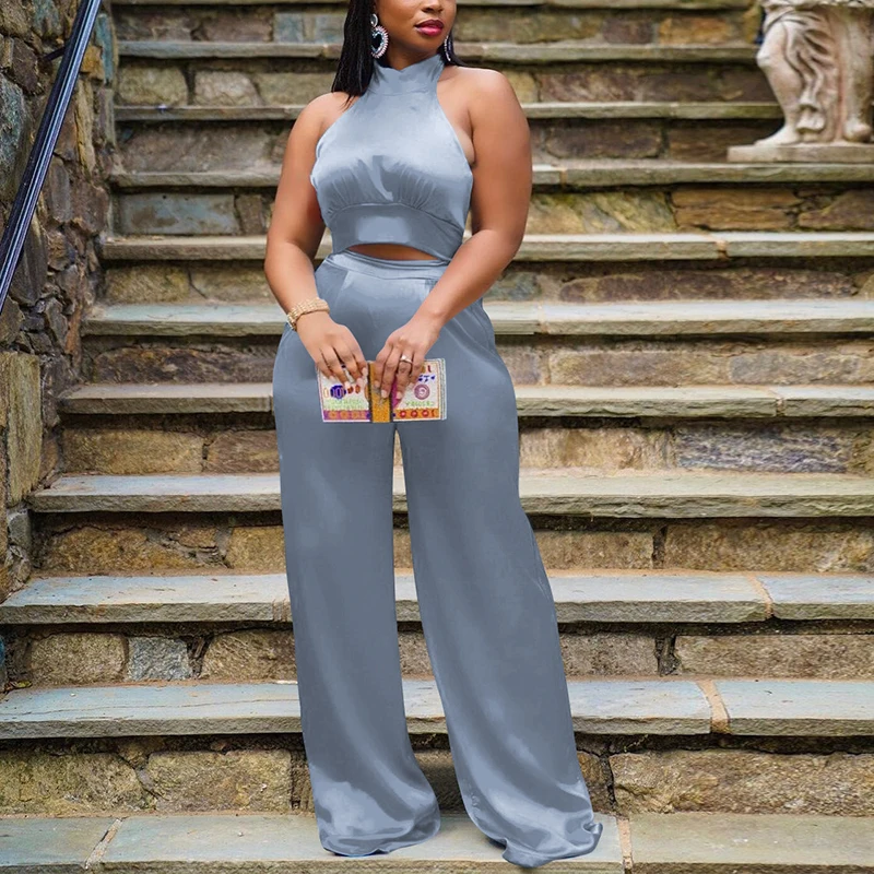 Two Piece Silky Satin Suits Sleeveless Crop Top & Loose Pants Set
