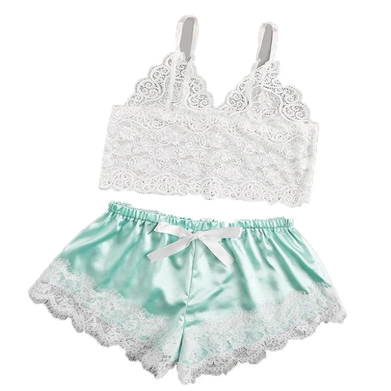 Two Piece Suit Women Pajamas Sexy Sling V Neck Sleepwear Satin Top And Shorts Splicing Lace Solid Nightclothes Female Pijama Set