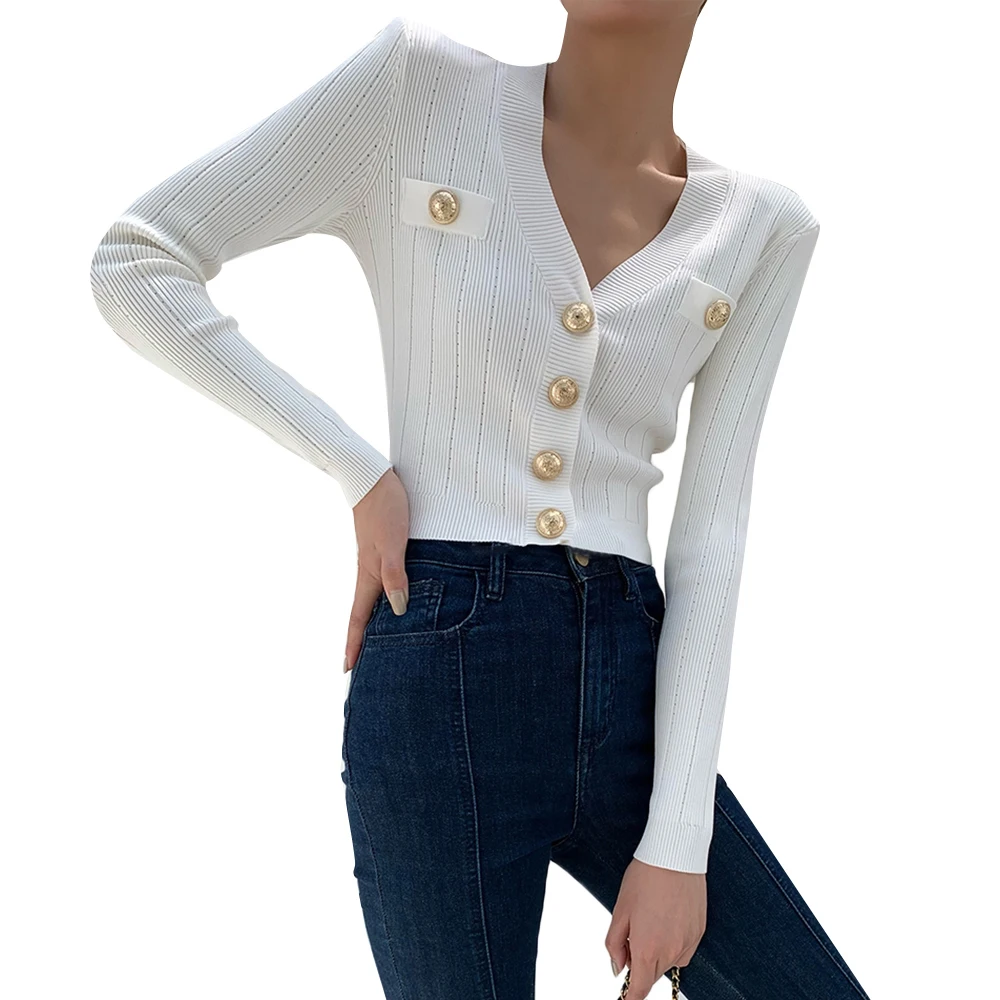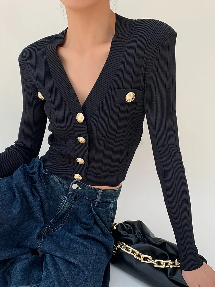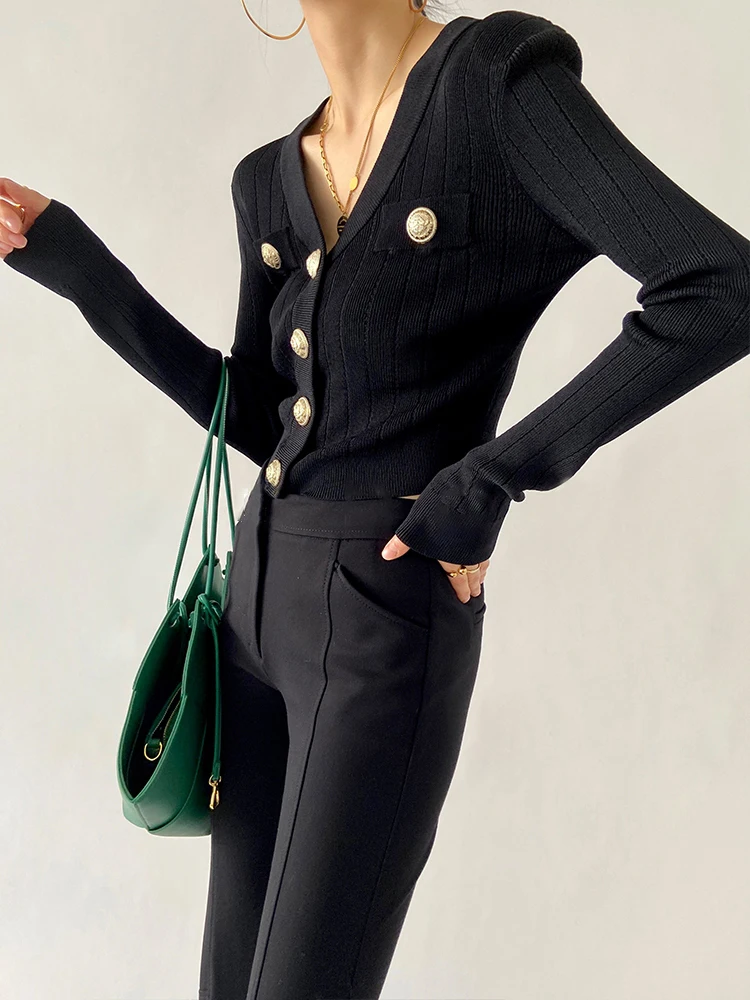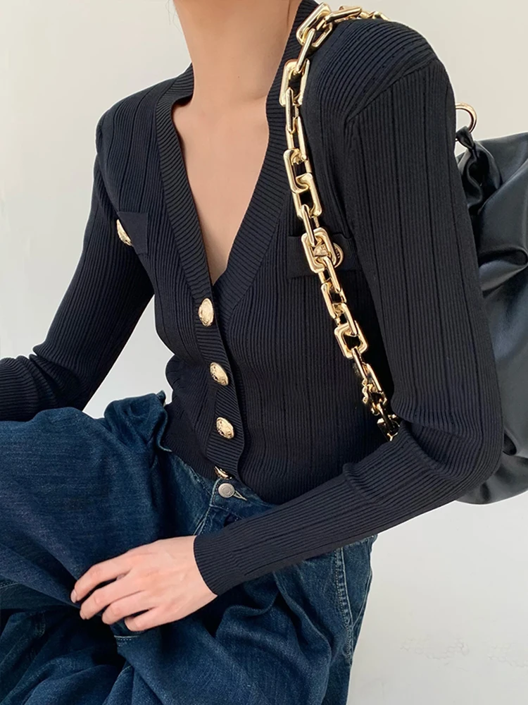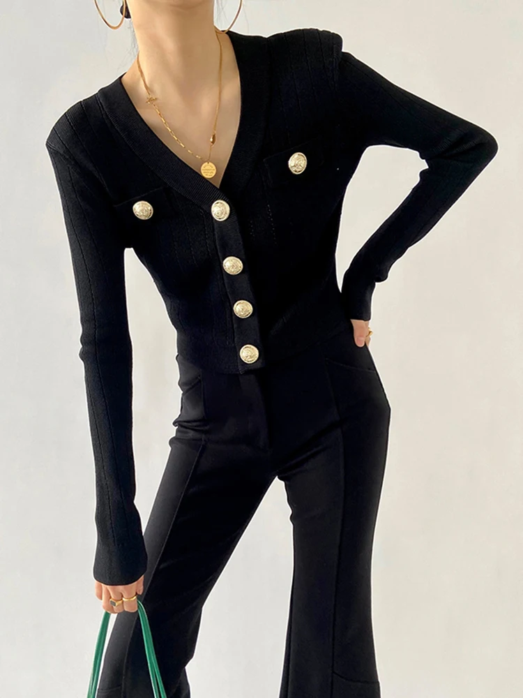 TWOTWINSTYLE Black Knitting Sweater For Women V Neck Long Sleeve Solid Minimalsit Elegant Cardigan Female Clothing Fashion Style