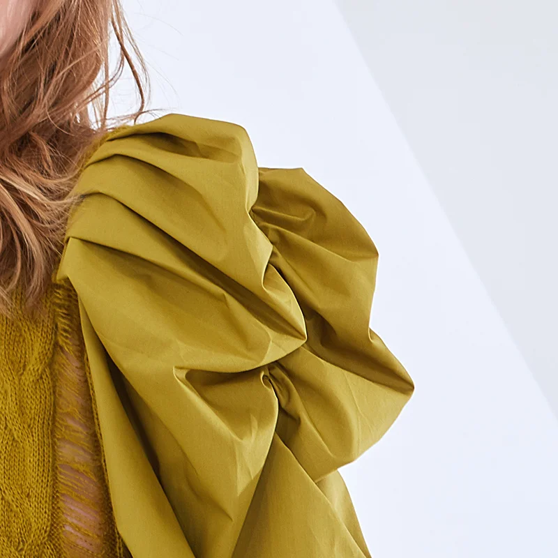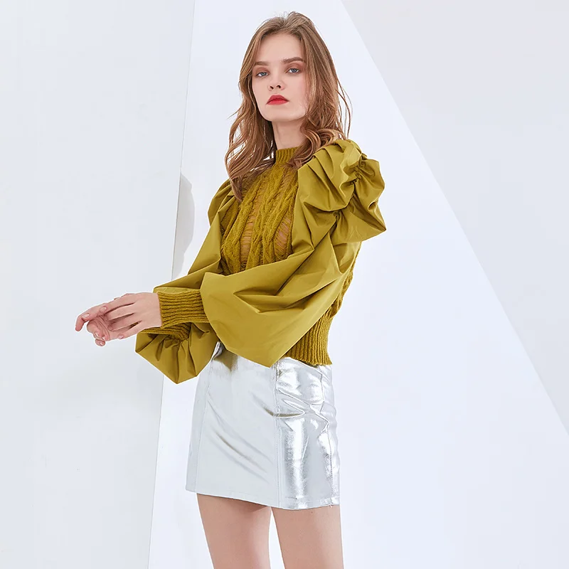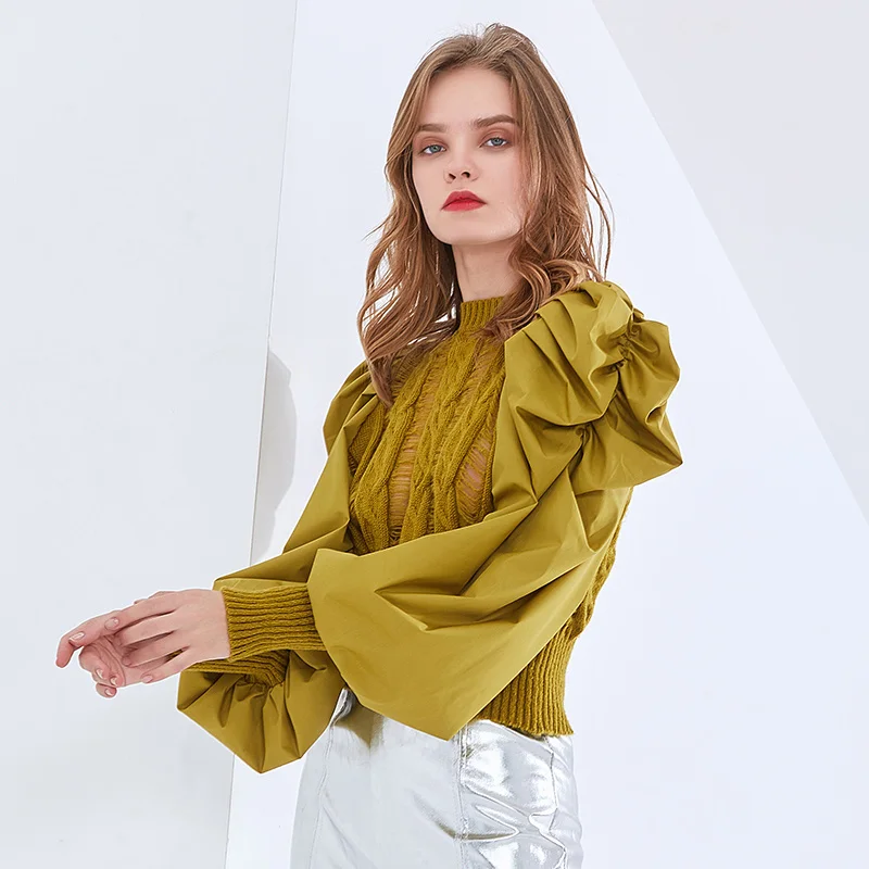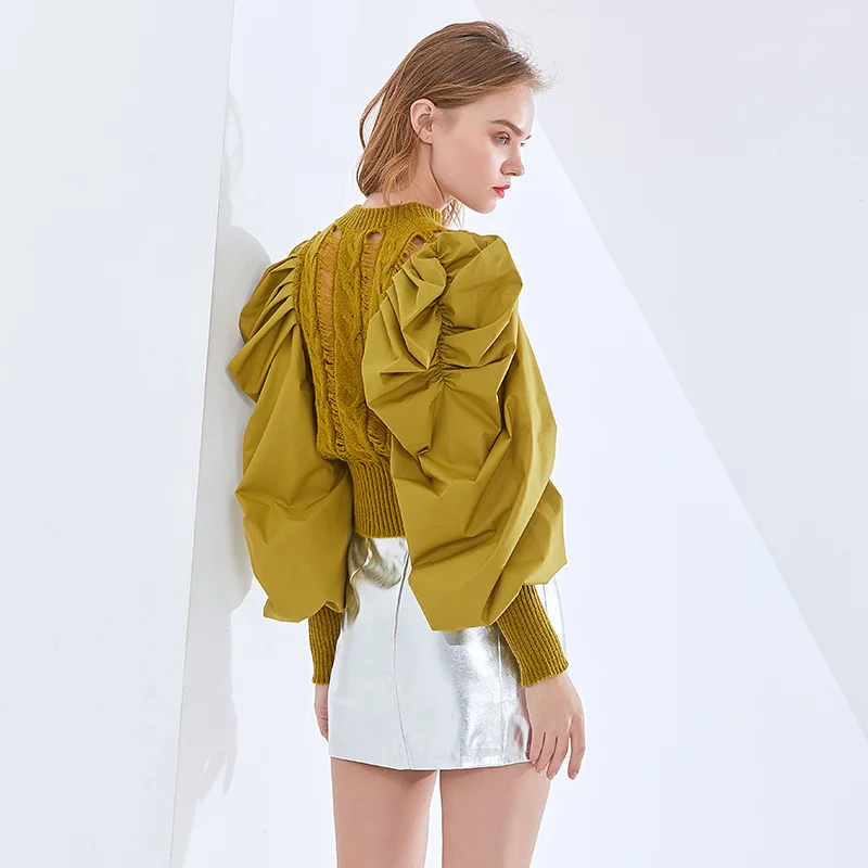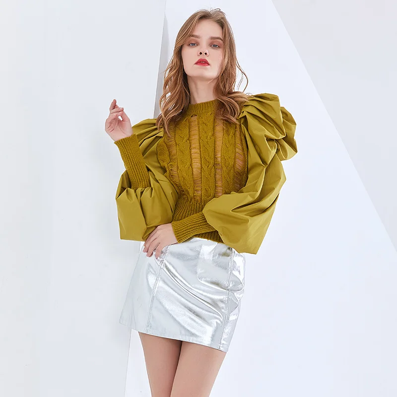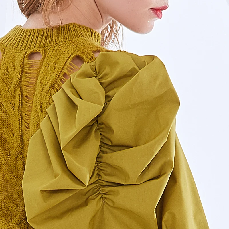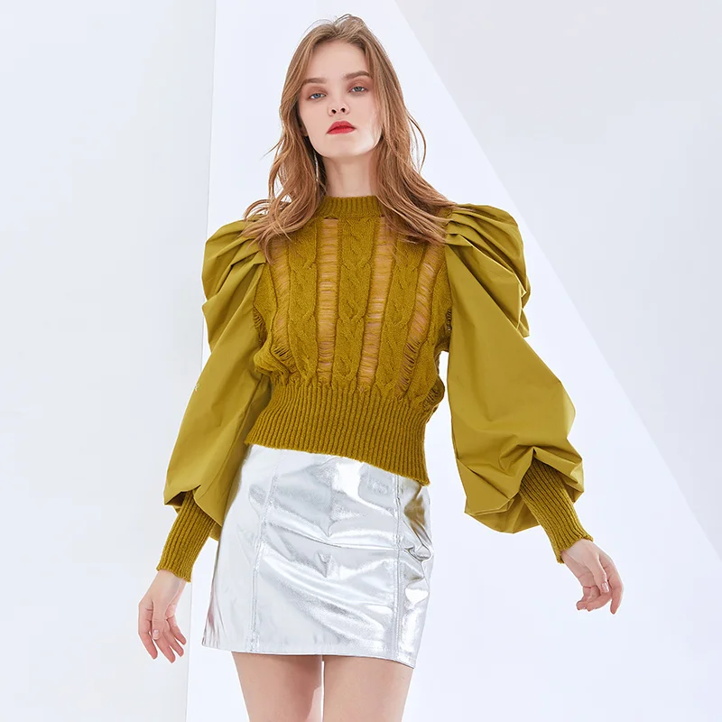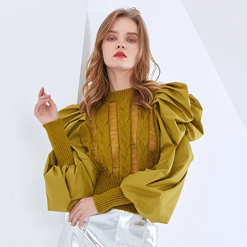 TWOTWINSTYLE Elegant Patchwork Sweater For Women O Neck Puff Long Sleeve Casual Knitted Pullovers Female Fashion New Clothing