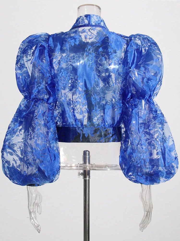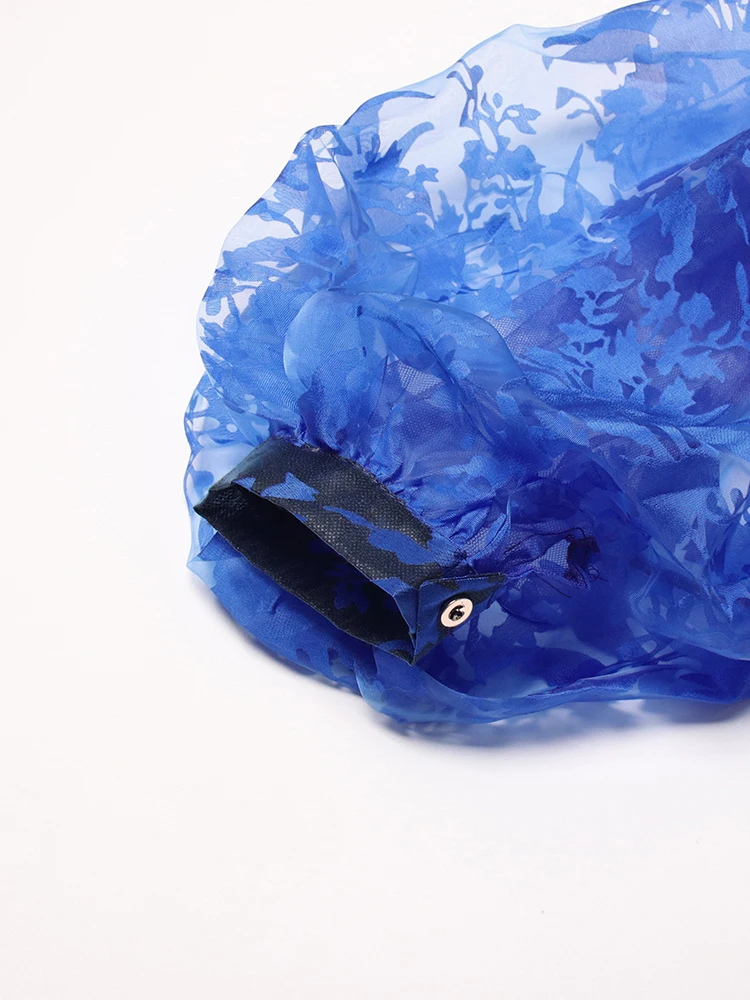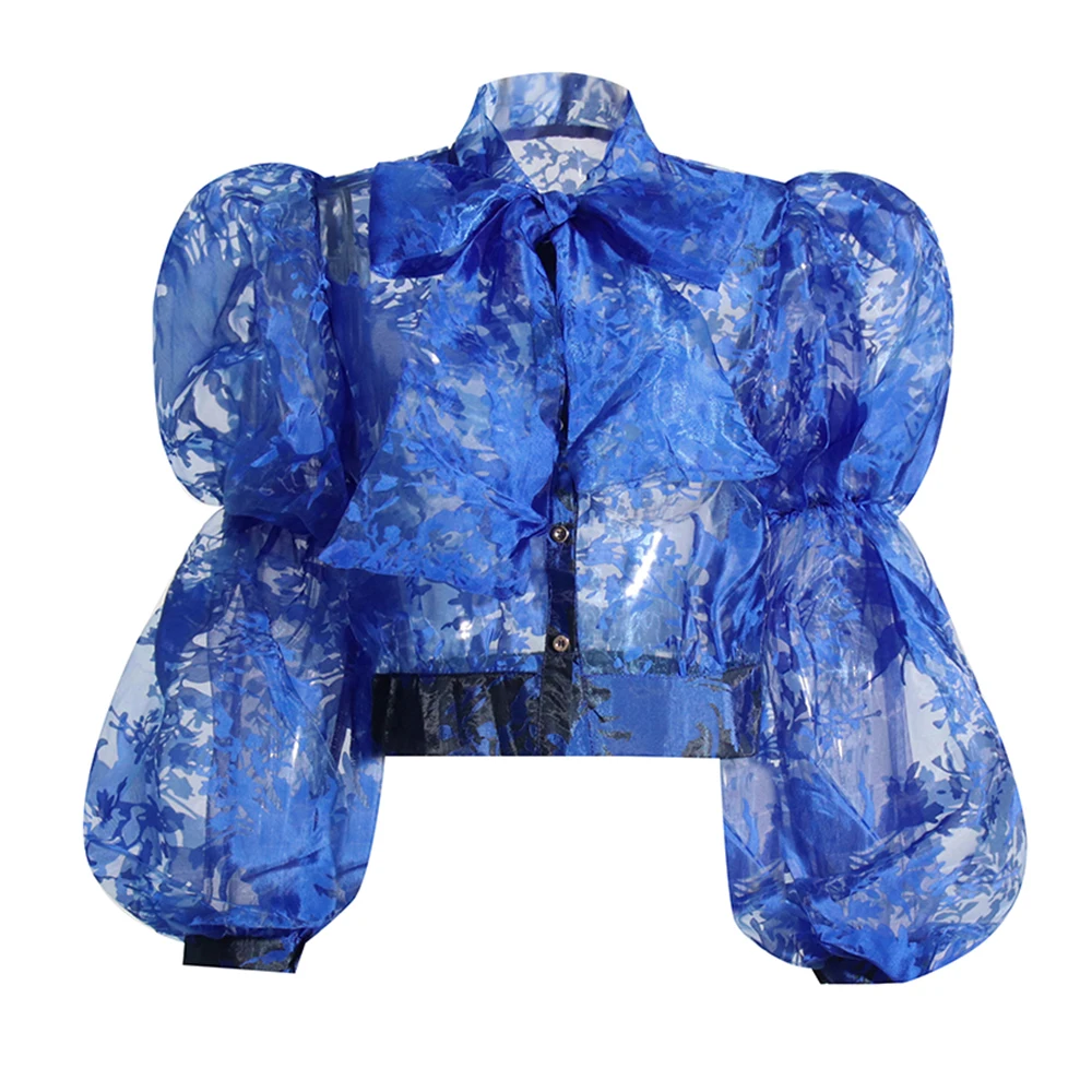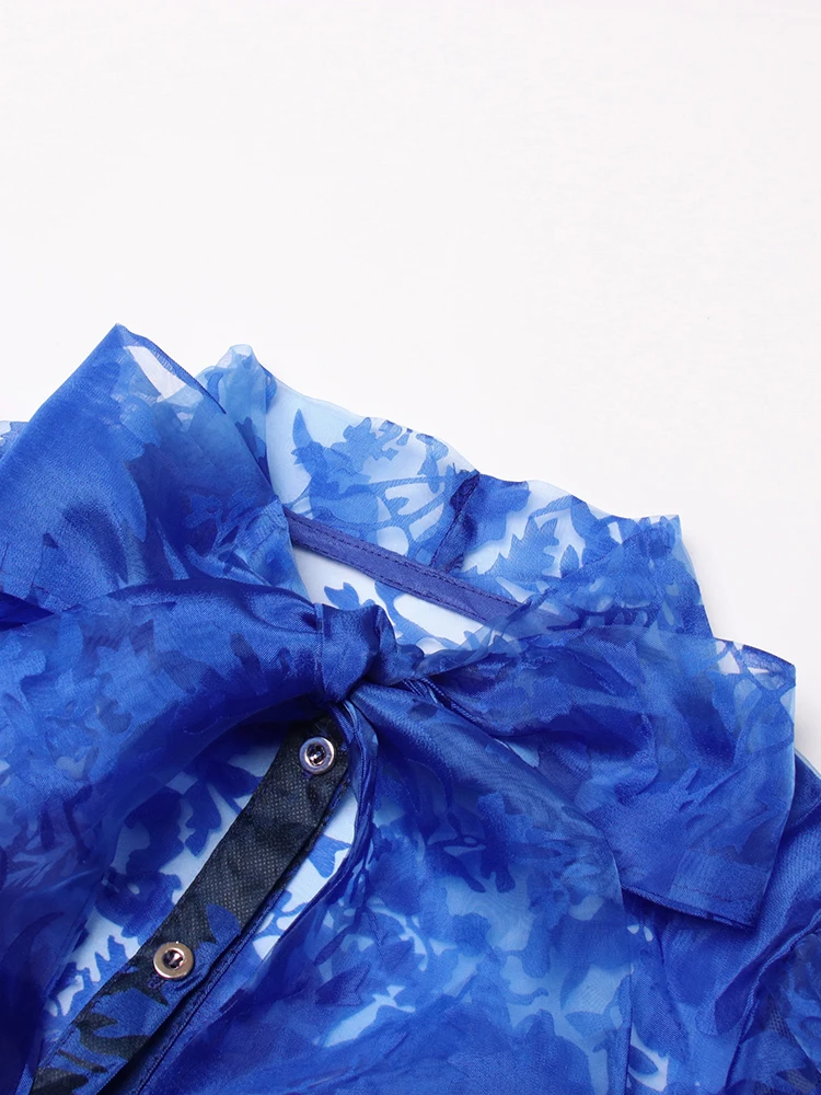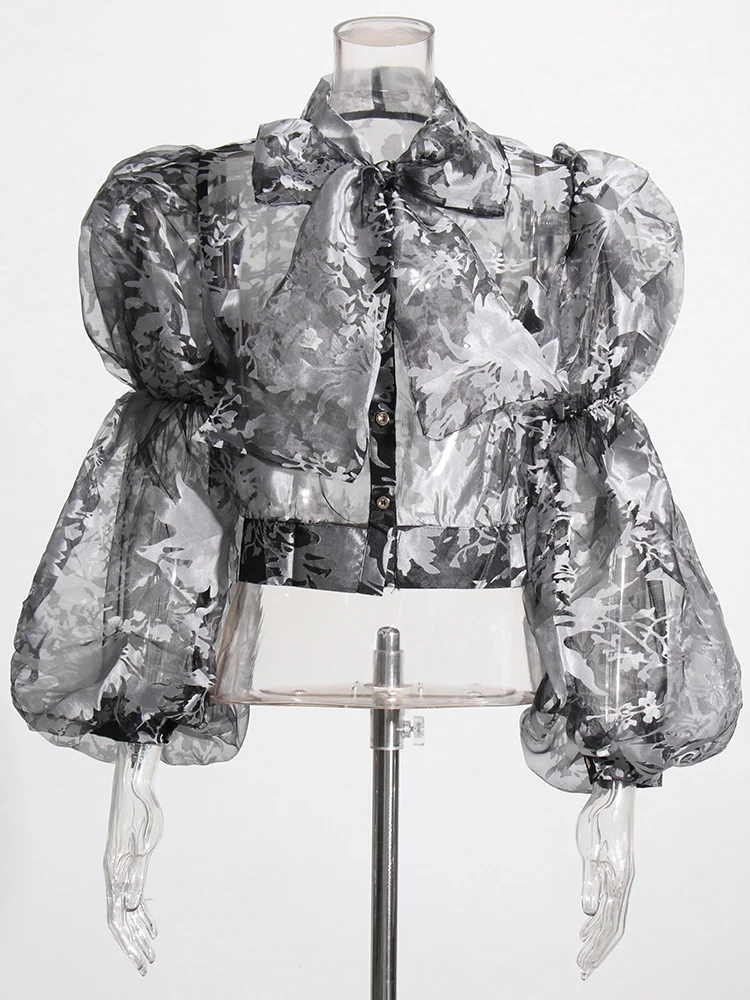 TWOTWINSTYLE Ruched Pullover Shirt For Women Bow Collar Puff Sleeve Print Colorblock Blouses Female Autumn Clothing Fashion New
