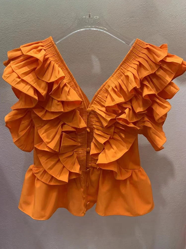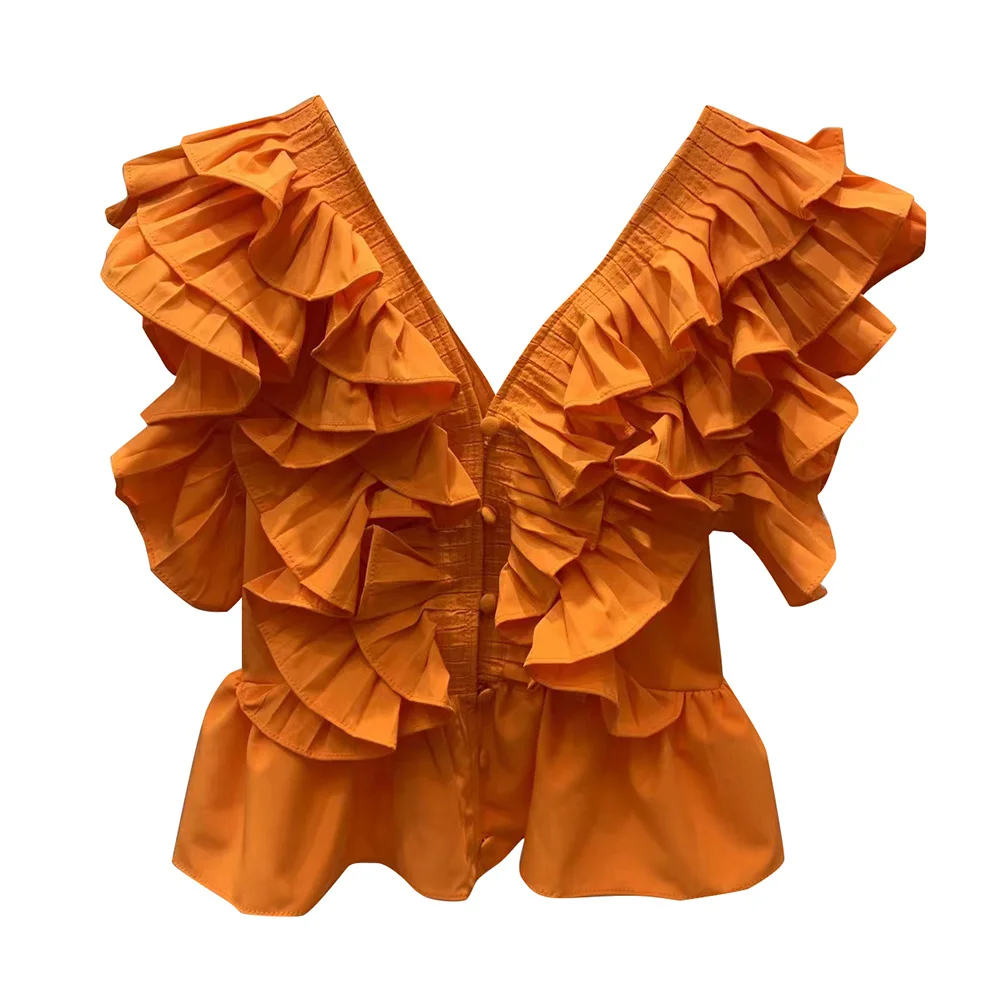 TWOTWINSTYLE Sexy Loose Shirt For Women V Neck Sleeveless Ruffles Ruched Blouses Female Summer Clothing New Style Fashion
