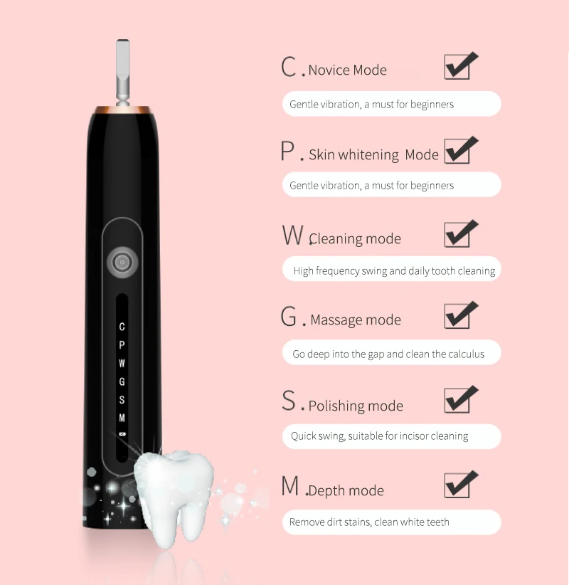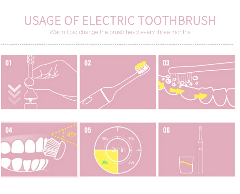 3.Help develop scientific tooth brushing habits: 30 seconds 2 minutes smart timer, trigger the handle timer every 30 seconds, let you know when to switch the oral area, 2 minutes to end brushing reminder, develop the recommended brushing by the dentist Habits (recommended best time to brush your teeth)