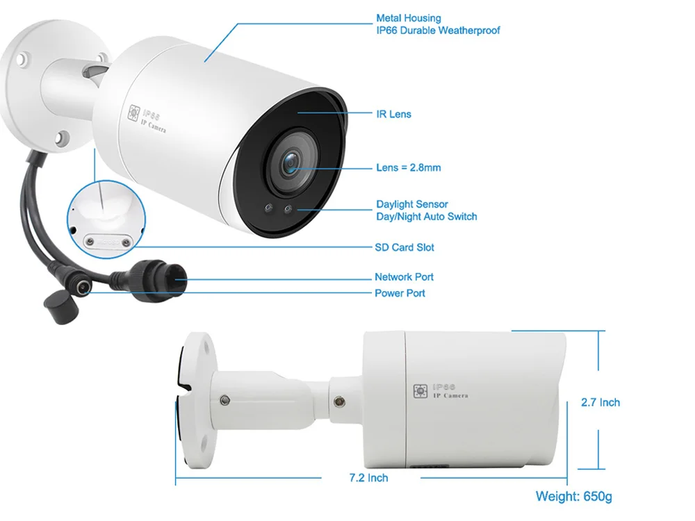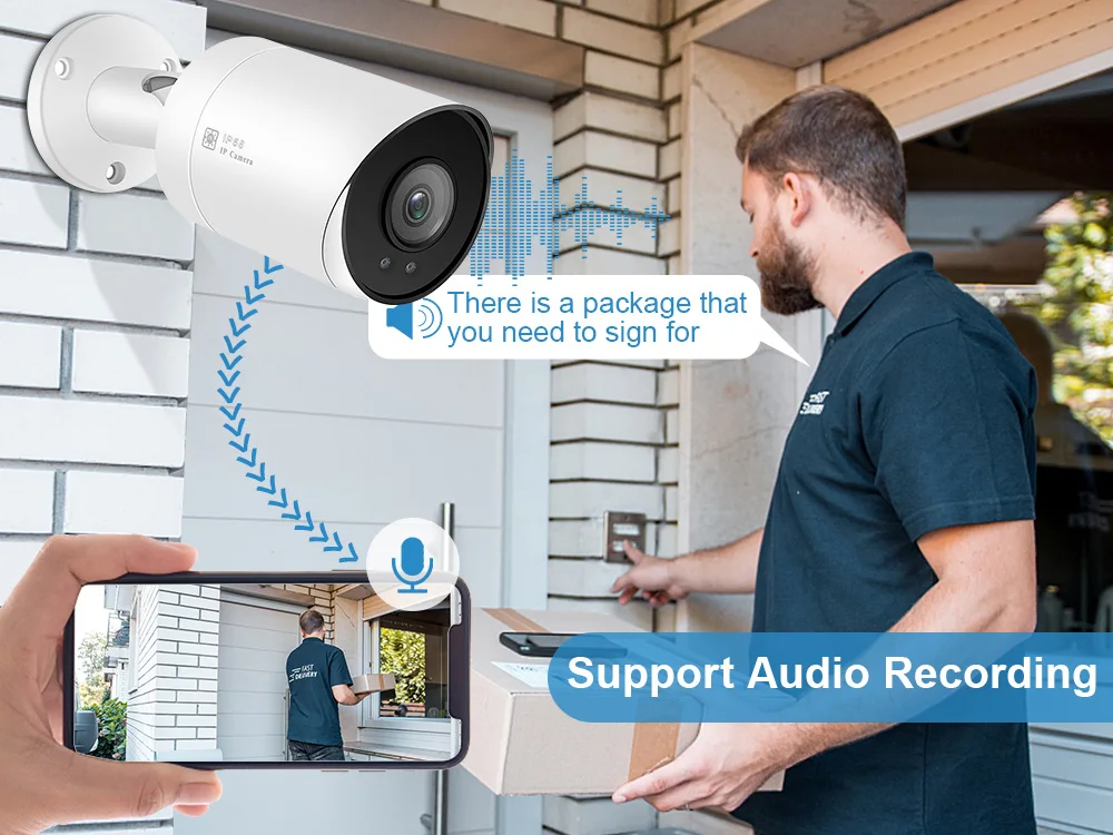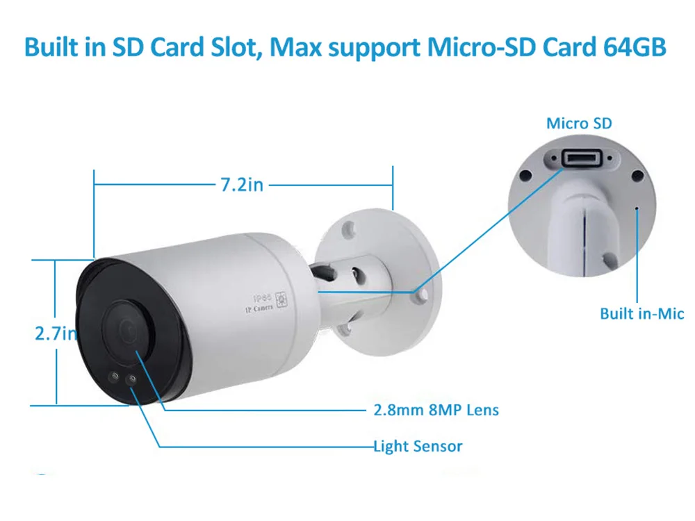 This bullet ip camera builts in one-way listen in Audio ( without speaker) so you could hear what is happening. SD Card Slot supports max Miro SD Card 128G. SD Card not included.