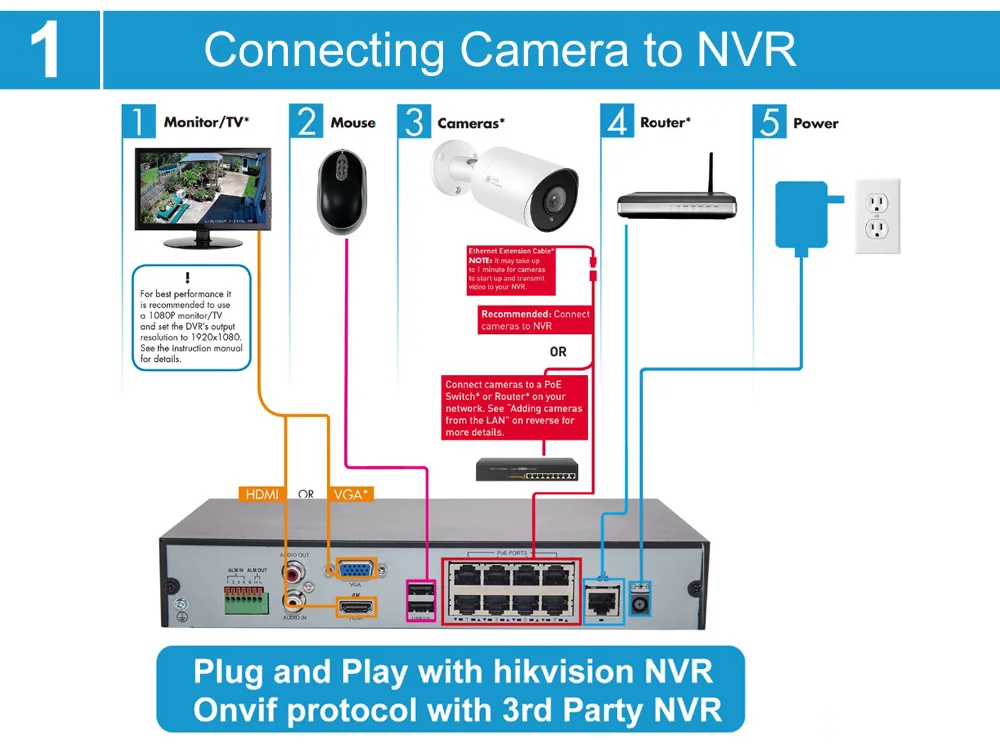 No any other extra operations, directly connect our Anpviz 5MP Security Dome Camera to Hikvision NVR POE ports.   Hikvision private agreement will make sure it ” Play & Play ” immediately.