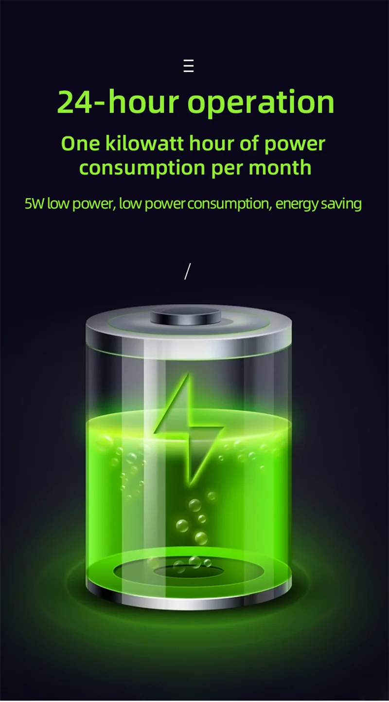 5.24 hours of operation, 1 kilowatt-hour of electricity consumption a month, 5w low power, low power consumption, energy saving and electricity saving