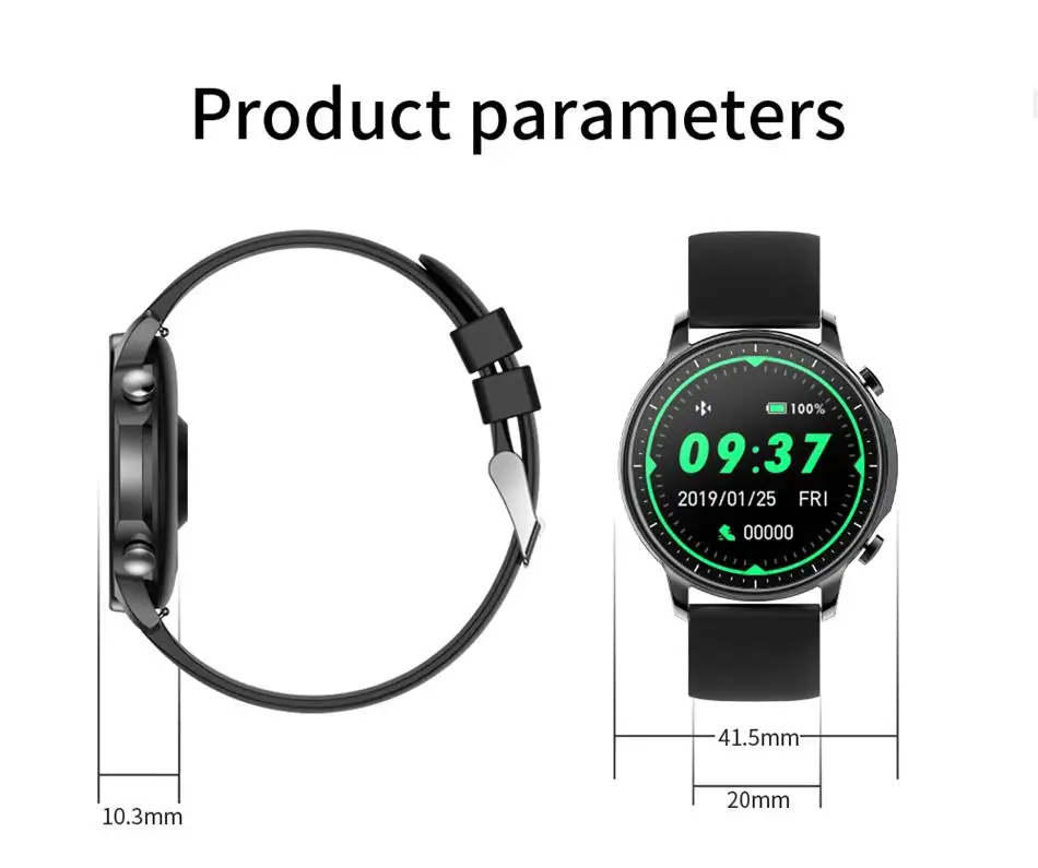 Productsize: 41.5*10.3mm Productweight: About4l.5g Waterproof and dustproof: IP67 Masterchip: RTK8762C APP: DA FIT CompatibLesystem: ANDROID4.4 (including4.4) and above! IOS8.0 (including 8.0) and above Coreparameters Screen: 1.28 inches full circle Resolution: 240*240 Touch type: full screen touch BT: BT5.0 Battery capacity: 200MAH Charging method: magnetic wire charging Strap width: standard 20mm interchangeable strap Features Multi-sports, heart rate, blood pressure, blood oxygen monitoring, phone information reminder, sleep monitoring, find mobile phone, alarm clock, control camera, sedentary reminder, stopwatch, brightness adjustment, multi-dial, etc.