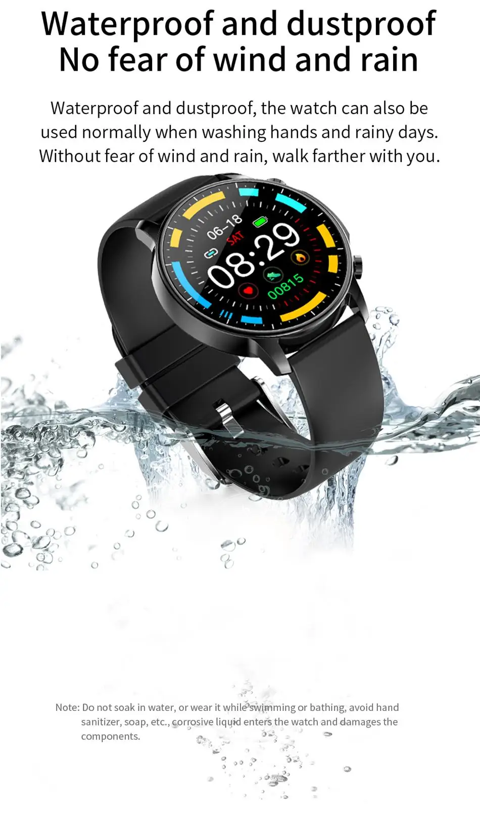 Waterproof and dustproof, the watch can also be used normally when washing hands and rainy days. Without fear of wind and rain, walk farther with you. Note: Do not soak in water, or wear it whi1svrnming or bathing, avoid hand sanitizer, soap, etc., corrosive Liqqd enters the watch and damages the components.