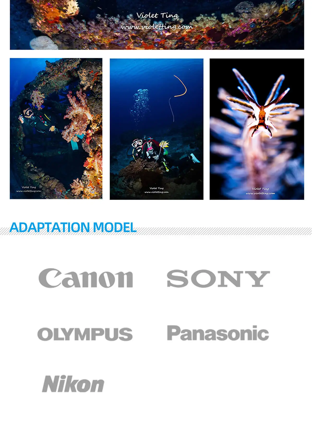 Perfect for shooting seascape, divers, ship wrecks and schools of fish, without moving further away from the subject, thereby still taking full advantage of water clarity and artificial light sources. Can be mounted on 67mm threaded lens ports or other lens ports by using an adaptor.