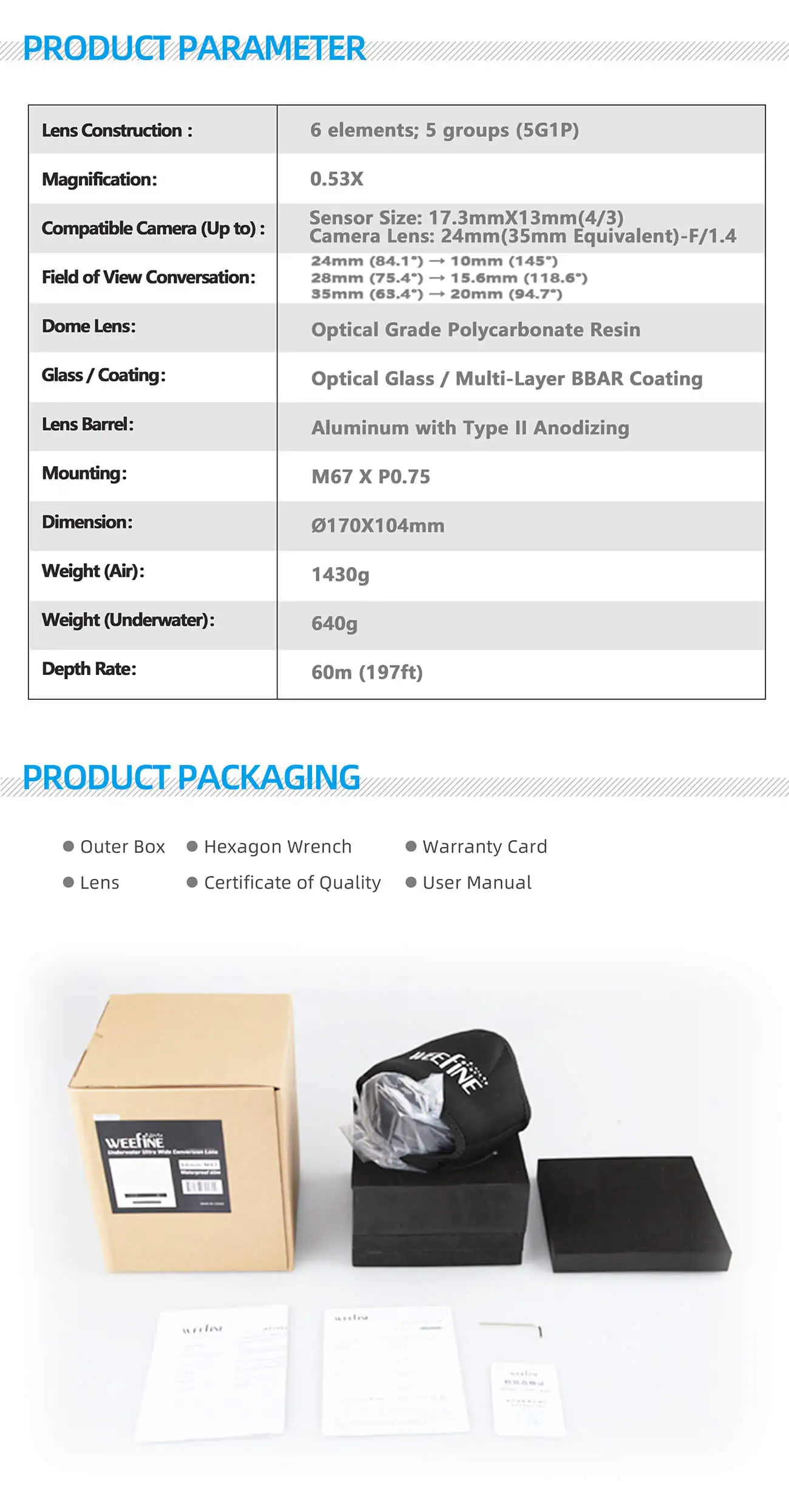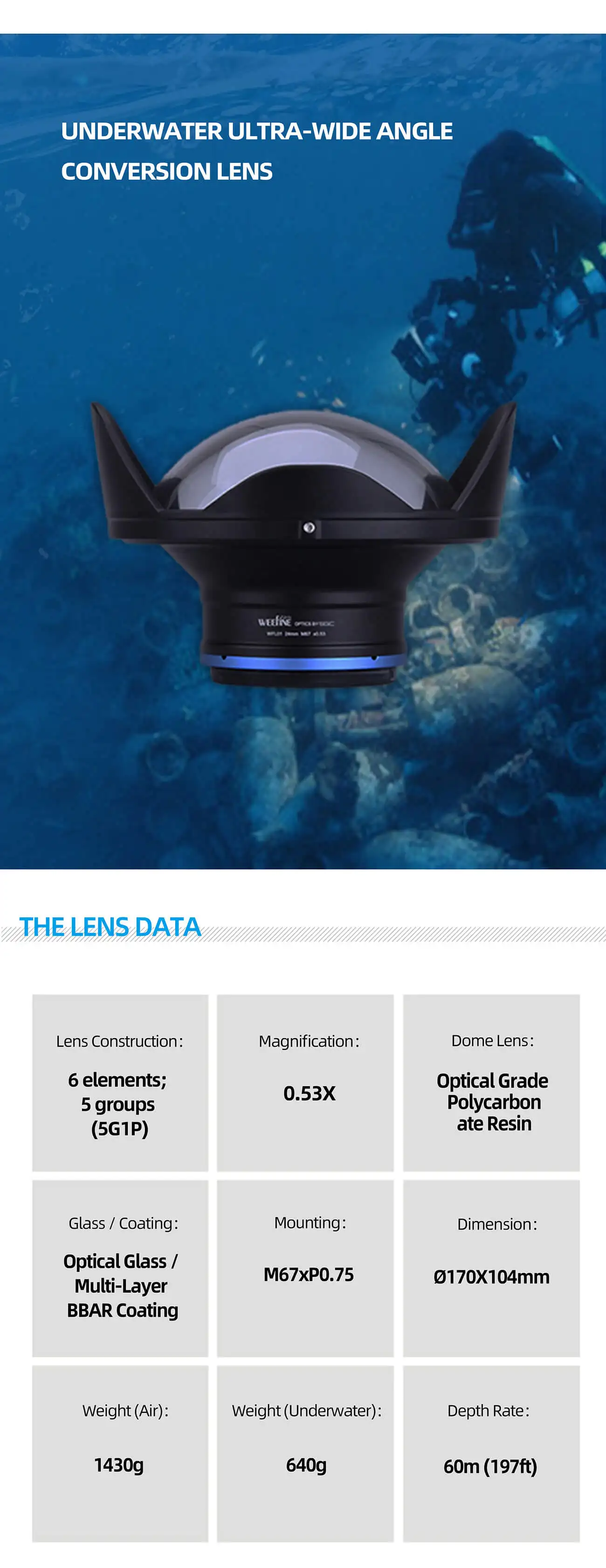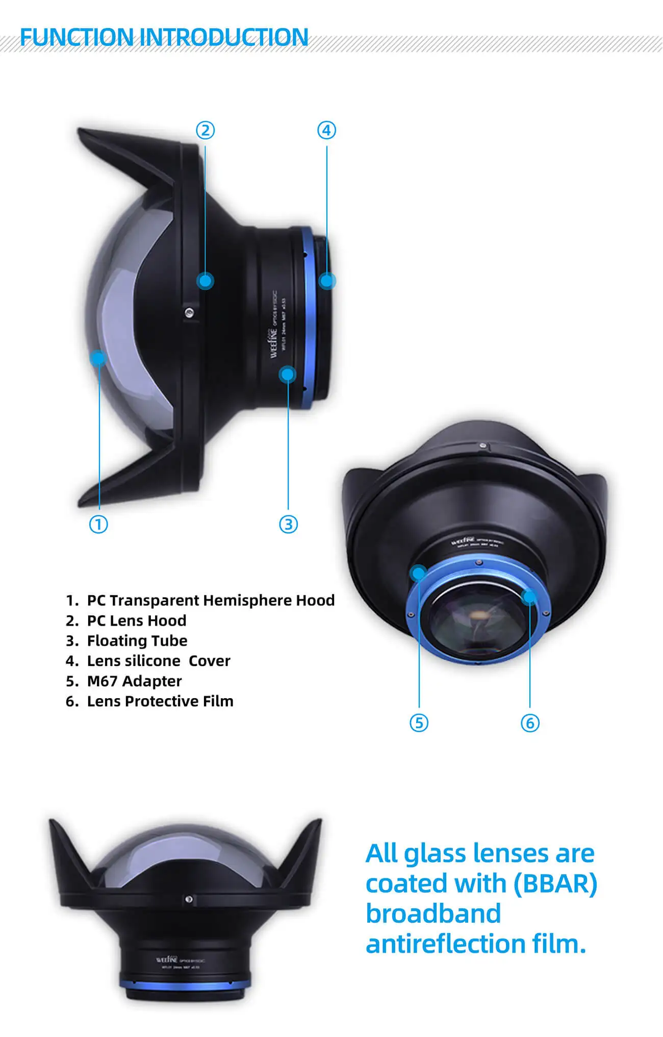 Weefine Diving Equipment WFL01 ultra wide-angle interchangeable lens is designed to be used with cameras with lenses as wide as 24mm (35mm equivalent) without noticeable vignetting. The diving gear is constructed from 4 high-quality low dispersion optical glasses and a hard coated polycarbonate dome to correct unwanted aberration. All the glass lenses have been coated with (BBAR) broadband anti-reflection coating. It is a professional diving supplies for photographer and videographer.