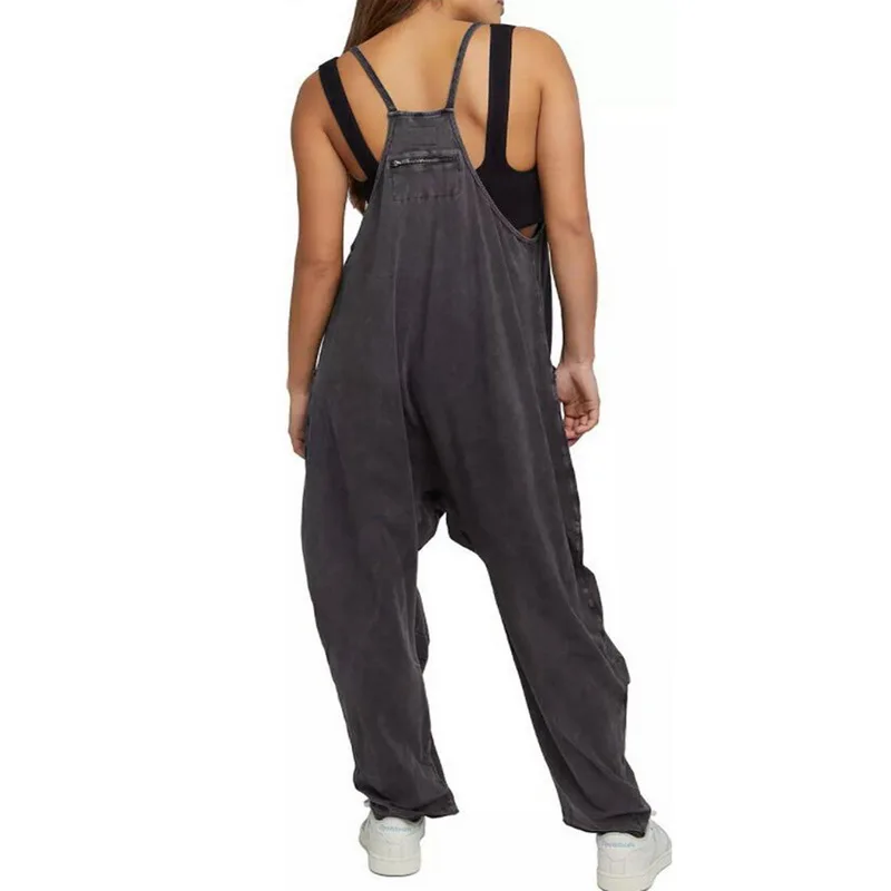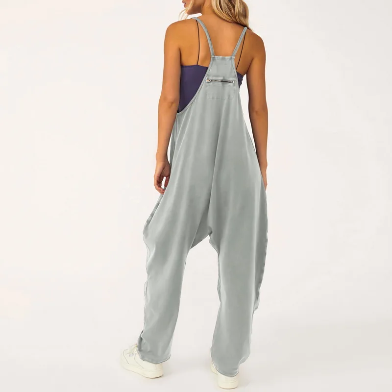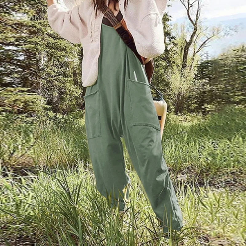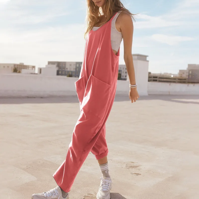 Women Casual Jumpsuits Summer Outfit Clothes Inelastic Sleeveless Loose Wide Leg Rompers with Large Pocket Homewear Cotton Pants