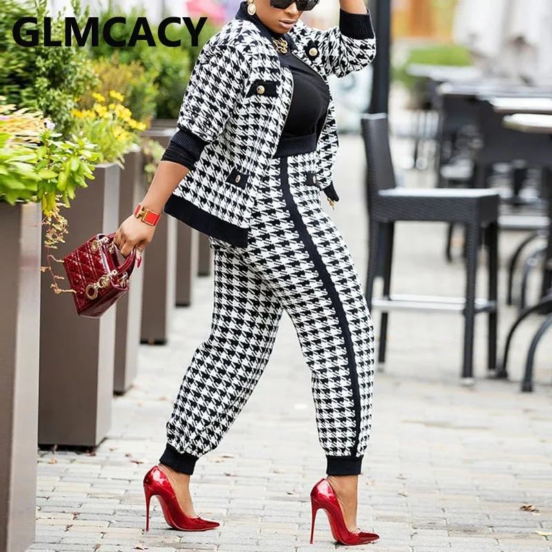 Women Houndstooth Two Piece Suits Elegant OL Workwear Jacket & Slim Pants Set
