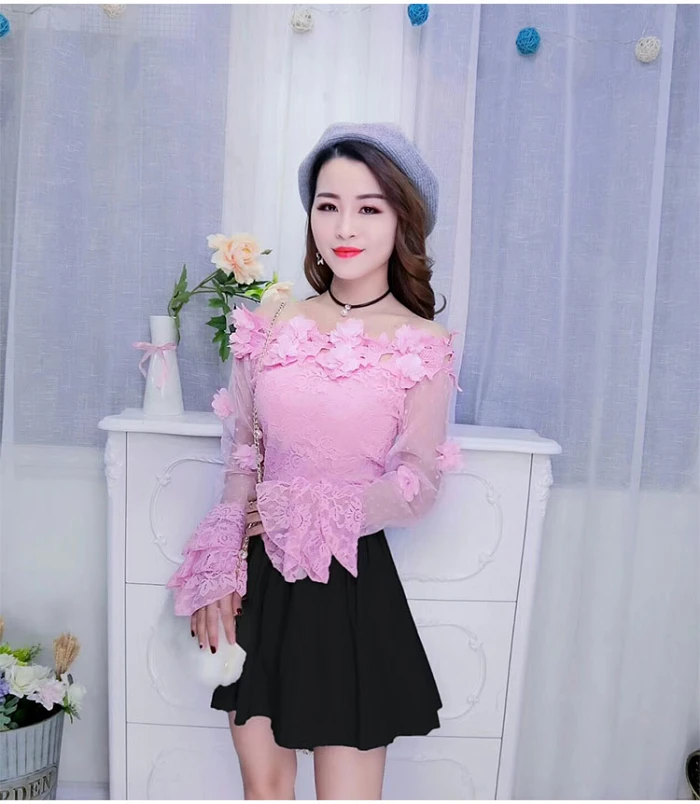 Women Lace Slash neck Blouse Casual Off Shoulder Top Sexy Club Long sleeves White Blouse Ladies Autumn Hollow Elegant Blouses