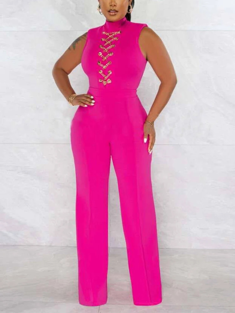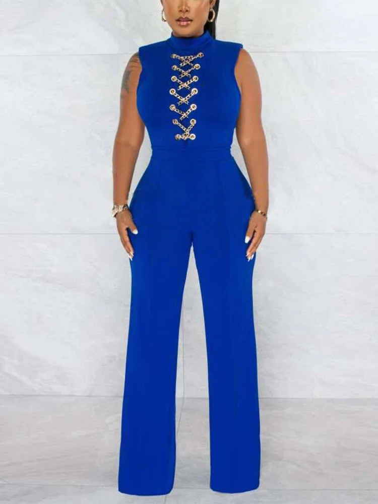 Women Sleeveless Casual Chain Lace Up Slim Jumpsuit