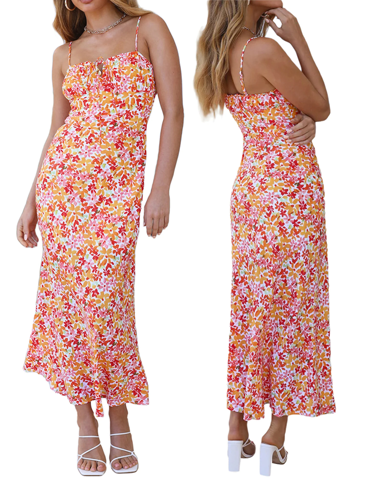 Women Summer Floral V Neck Spaghetti Strap Cam Dress For Woman Robe Sexy Bodycon Split Chic Mid-Calf Aesthetic Dress