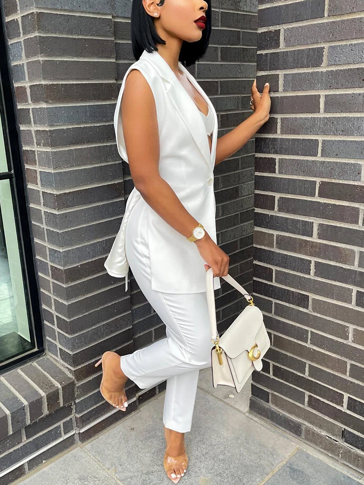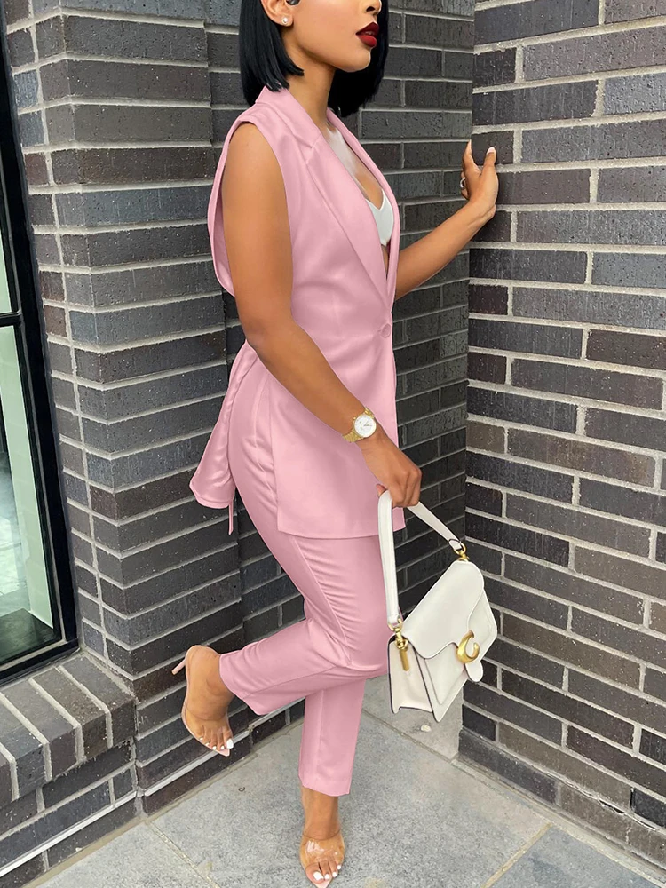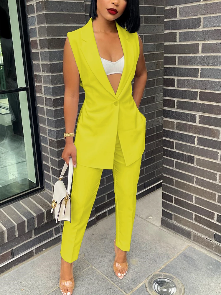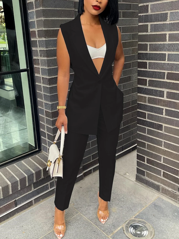 Women Two Piece Summer Blazer Set Sleeveless Notched Lapel Vest & Slim Pants Set