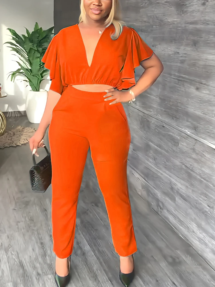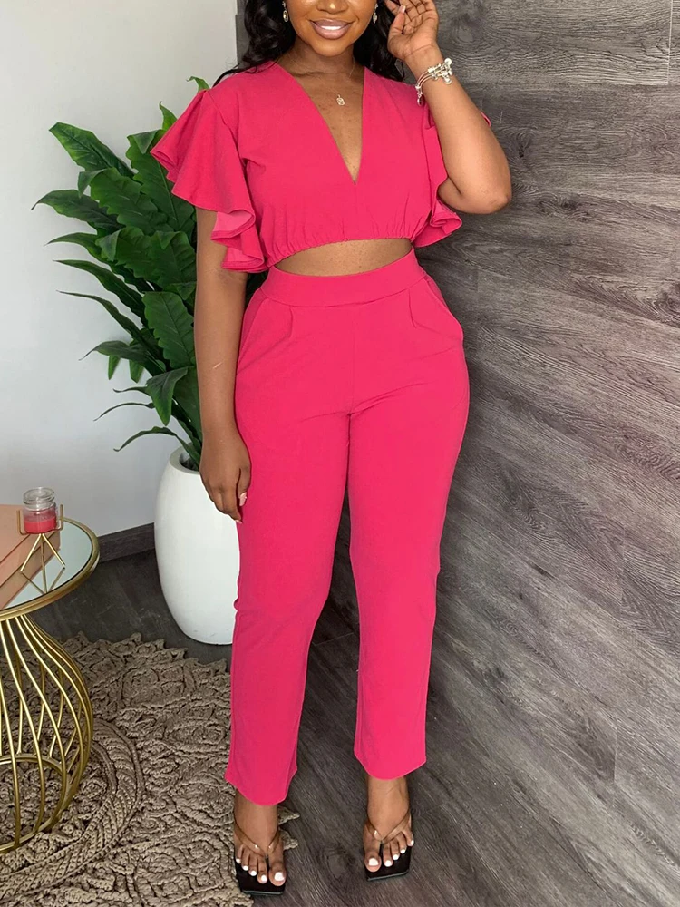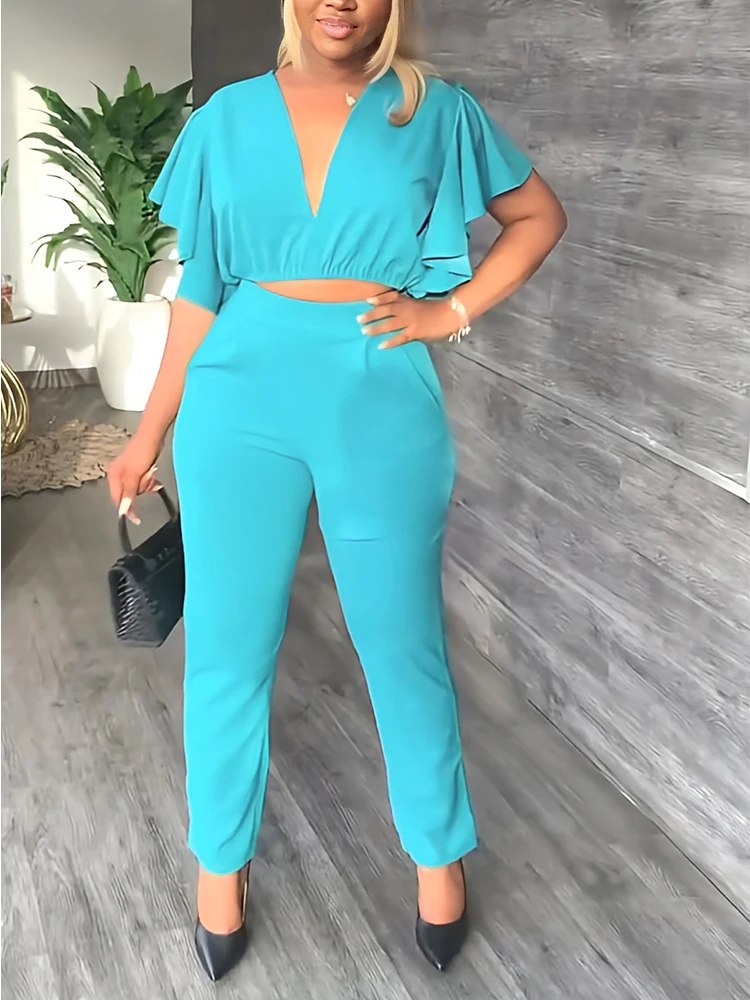 Women Two Piece Summer Sweet Suits Short Sleeve V Neck Crop Top & Slim Pants Set