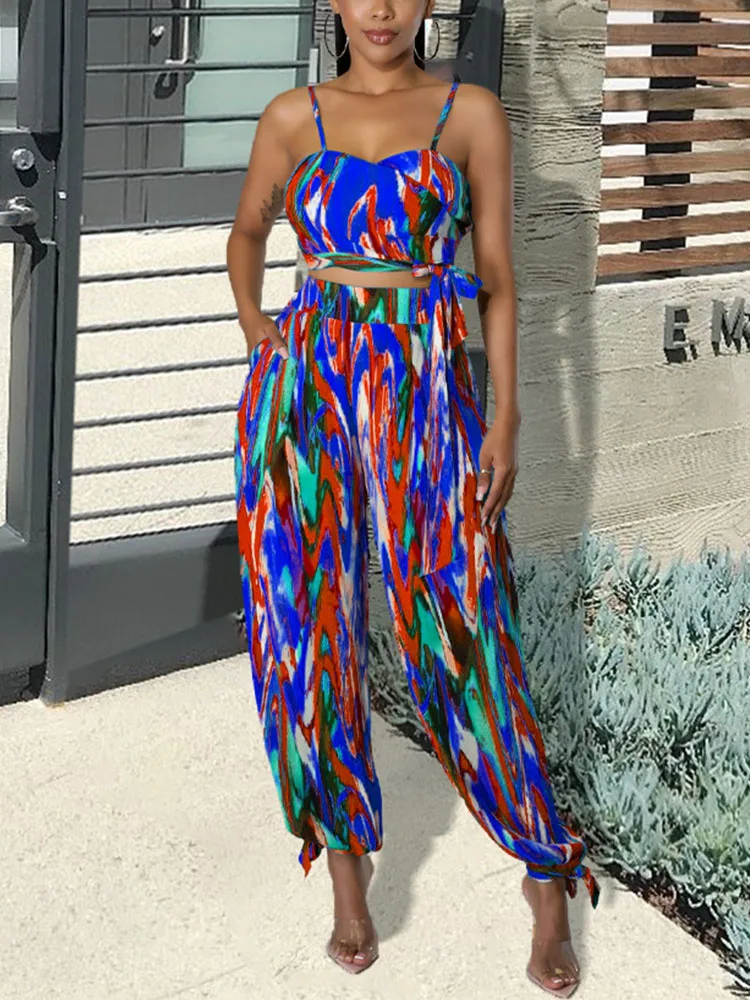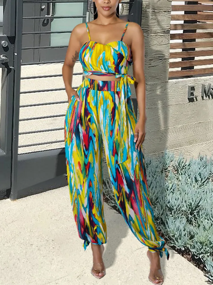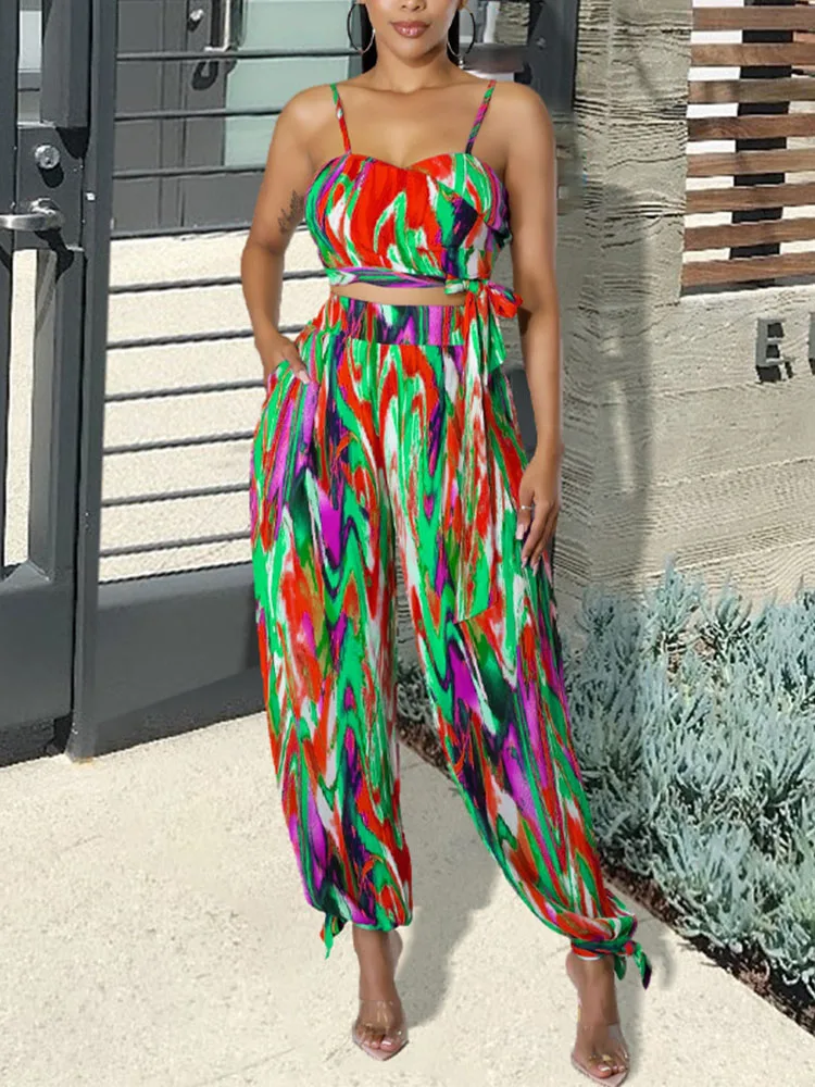 Women Two Piece Tie Dye Printed Suits Spaghetti Strap Crop Top & Wide Leg Loose Pants Set