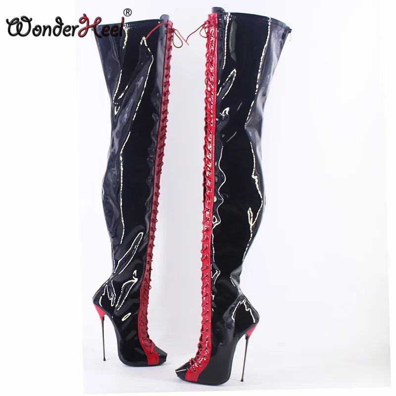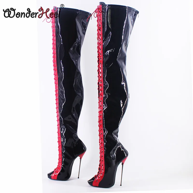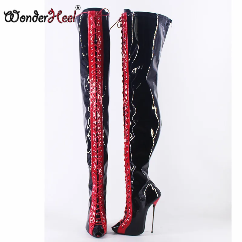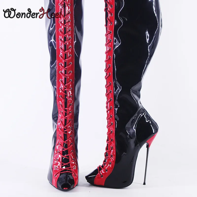 Wonderheel New 16cm Ultra Thin Metal heel Peep Toe Multi-color sexy Over Knee Boots Super Girls Nightclub Lace Up Crotch Boots