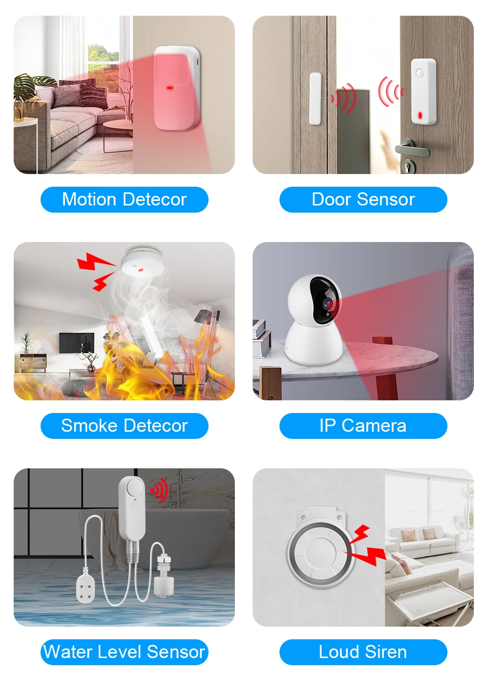 1、IN Case of fire :When products of combustion are sensed, the unit sounds with 80db pulsating alarm until the air is cleared.At the same time, the APP will push you a smoke alarm notice.